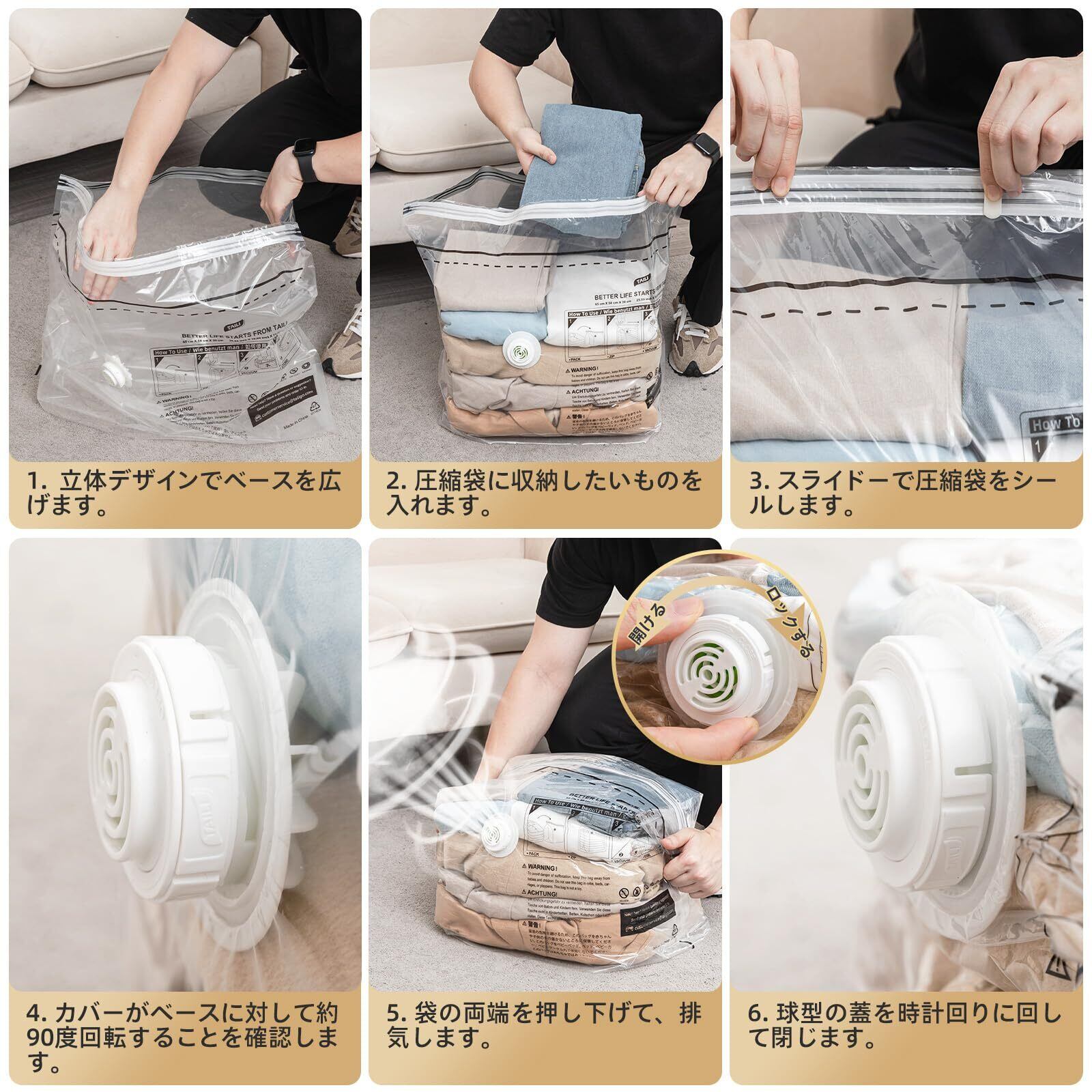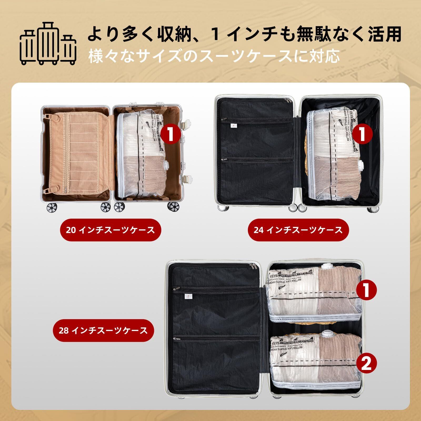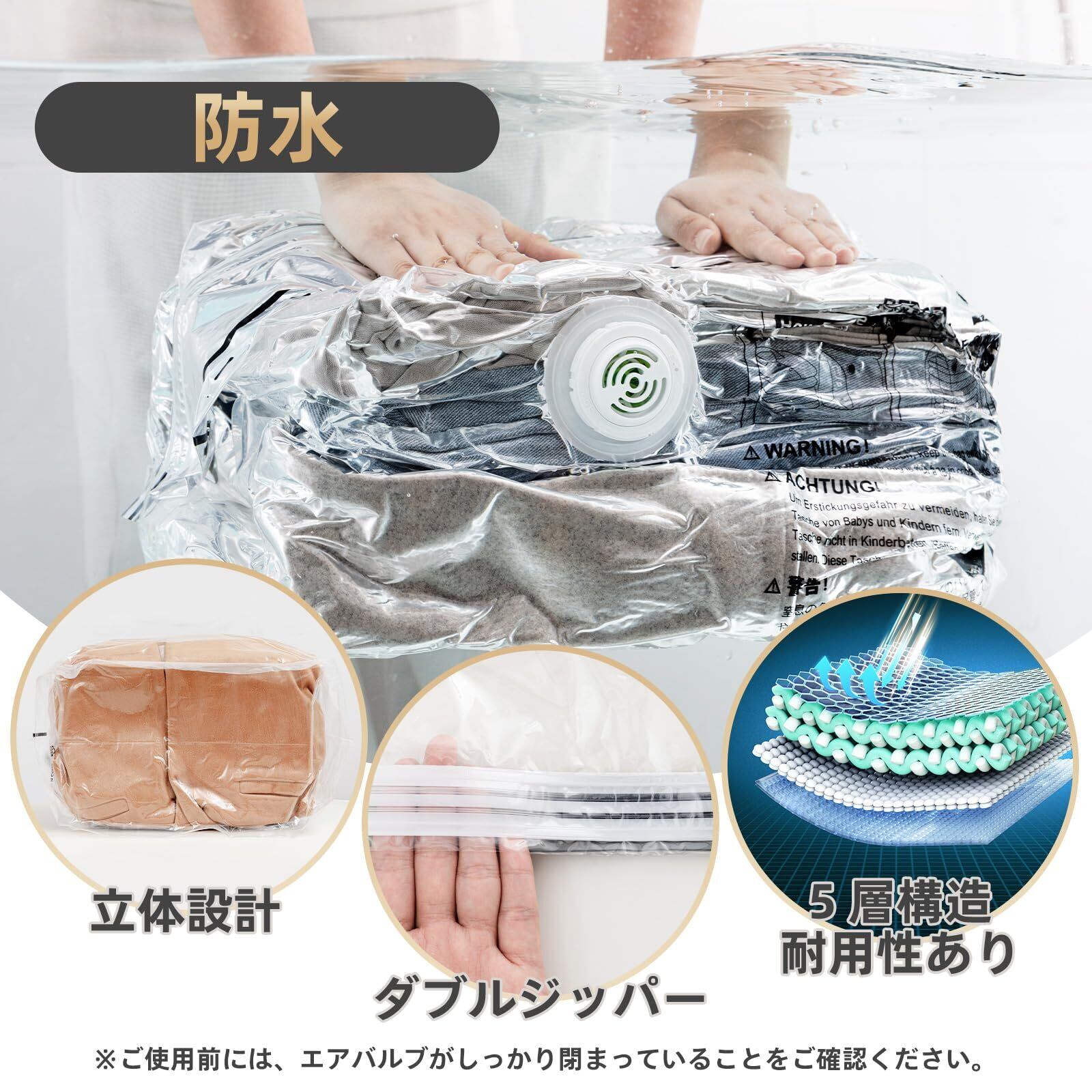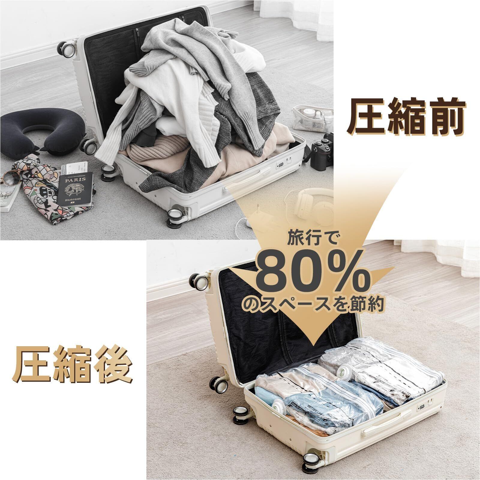 荷物スペースを最大化: 立体圧縮袋は、荷物真空バッグ間の隙間の無駄なスペースを減らすように設計されています。荷物のスペースを最大限に活用できるだけでなく、その他の旅行の必需品を収納できる整理されたスペースも確保します。機内持ち込み手荷物や旅行用の圧縮バッグとして最適です。真空バッグにより、ラゲッジスペースが最大 3 倍圧縮されます。頻繁に使用する場合でも安心してお使いいただけます