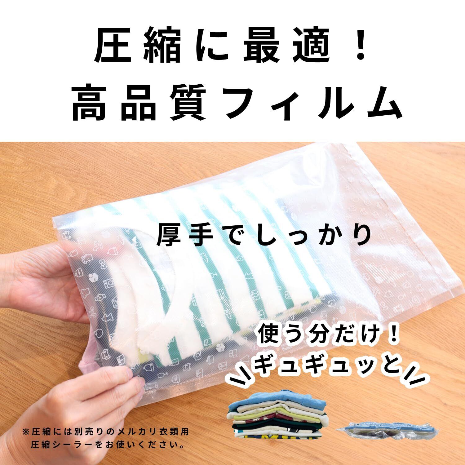 衣料用圧縮シーラー専用ロールフィルム。 メルカリやフリマサイト、商品の発送の梱包に最適な高品質なフィルムを目指しました。 フィルムはエンボス加工で破けにくい厚さ!専用の衣料用圧縮シーラーで密封すれば防水だから、水濡れも安心。 送料を抑えるための圧縮時や、商品の保護としての梱包材としても! 専用の衣料用圧縮シーラーで密封すれば、ほこりや汚れ、湿気、虫などから 大切なものを守れるから屋根裏、ロフト、押し入れなどに安心して収納できる!