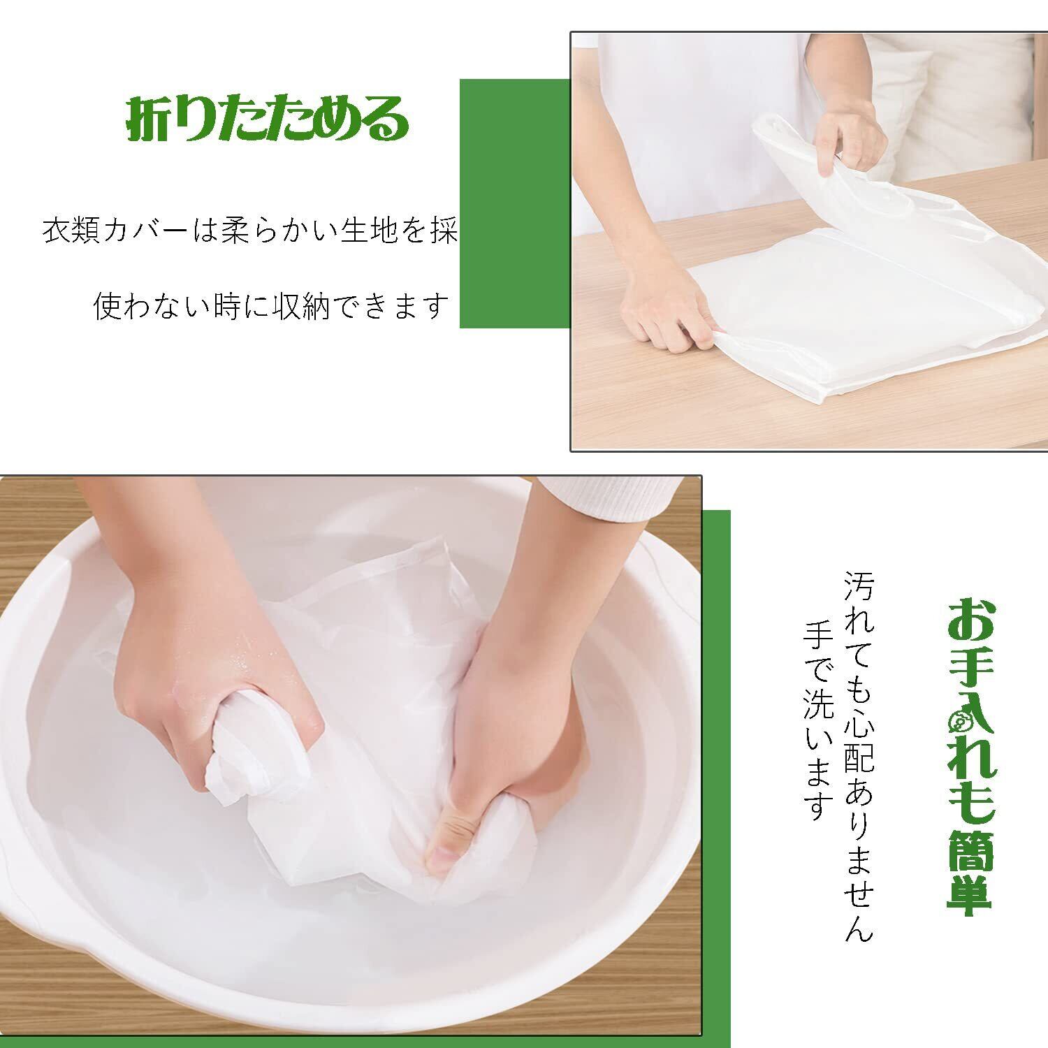 【水洗え、半透明衣類カバー】カバー全体がPEVAで作られ、ハンガーラックに掛けた衣類をホコリから守るのがもちろん、撥水加工もされているため、汚れやホコリの掃除の際は手で洗えて、繰り返す使える衣類カバーです。半透明製で中の内容物を分かりやすく、無地でお部屋に馴染むカラーで、違和感がなくて使え、美観的です。