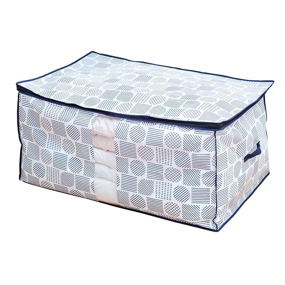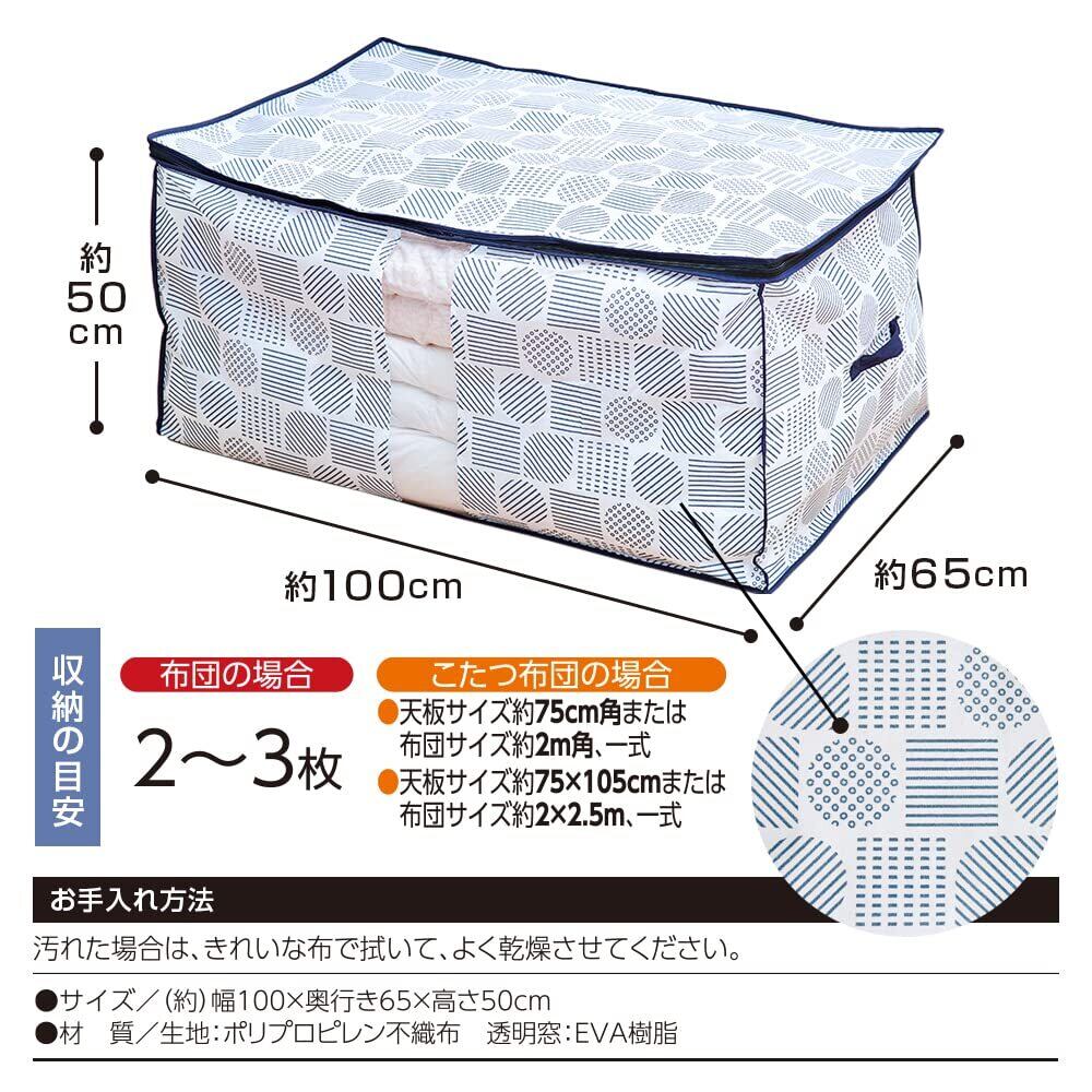 ホコリを防ぎ、おしゃれに収納。布団やこたつ布団の収納に。通気性のよい不織布製で、中身が分かる透明窓付き。大きく開くファスナーで出し入れしやすい。便利な持ち手付き。