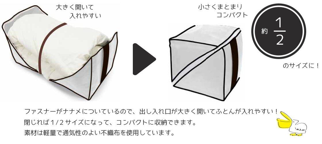 出し入れ口がナナメに開閉することで、かさばる羽毛ふとんをコンパクトに収納できます。素材には軽量で通気性のよい厚手の不織布を使用しています。