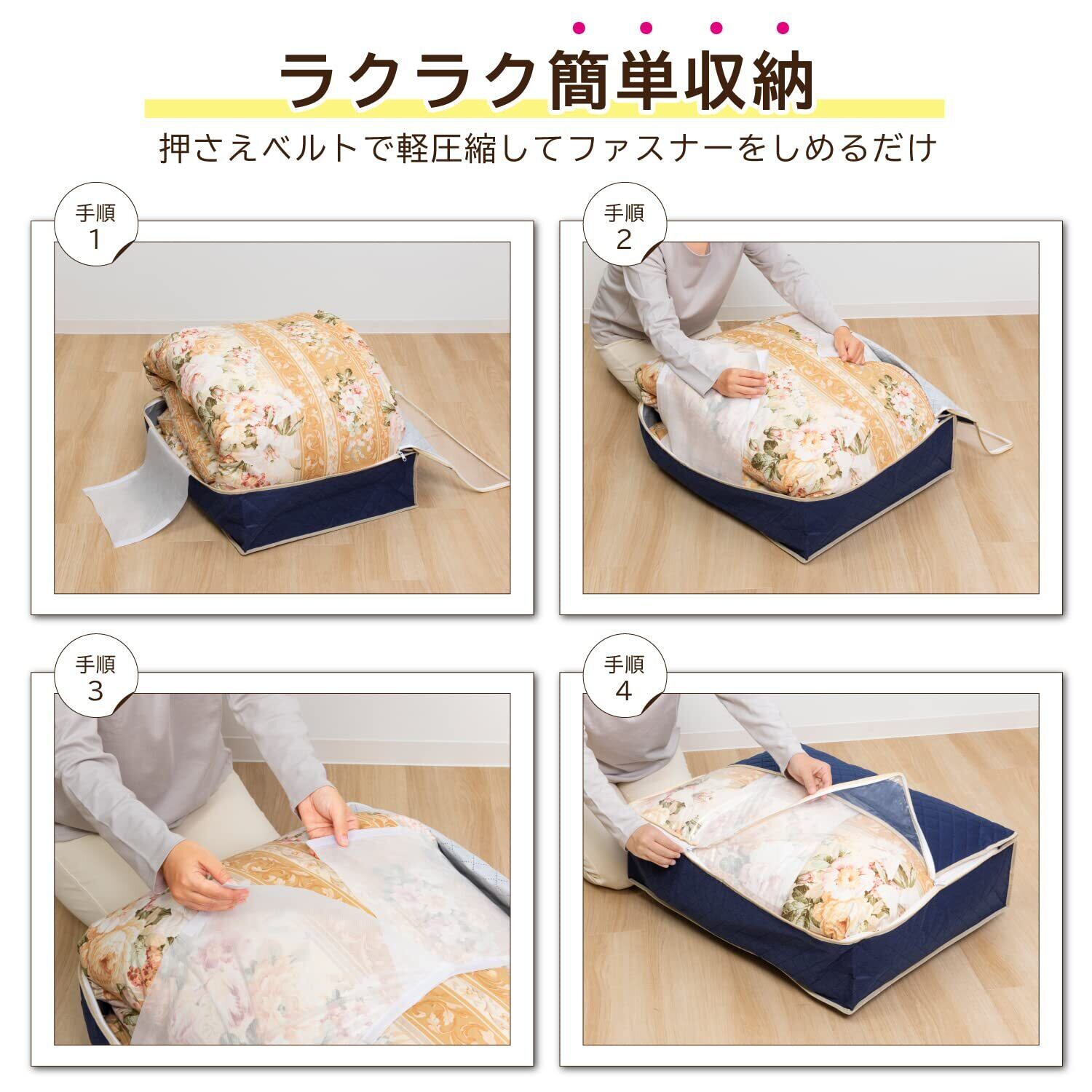 【羽毛布団のボリュームを優しく抑えて保管】:押さえベルト付きでかさばる羽毛布団の厚みを優しく抑え、スリムかつコンパクトに。圧縮しすぎないので羽毛を傷めにくく、ふかふか感や暖かさを次のシーズンまでキープ。