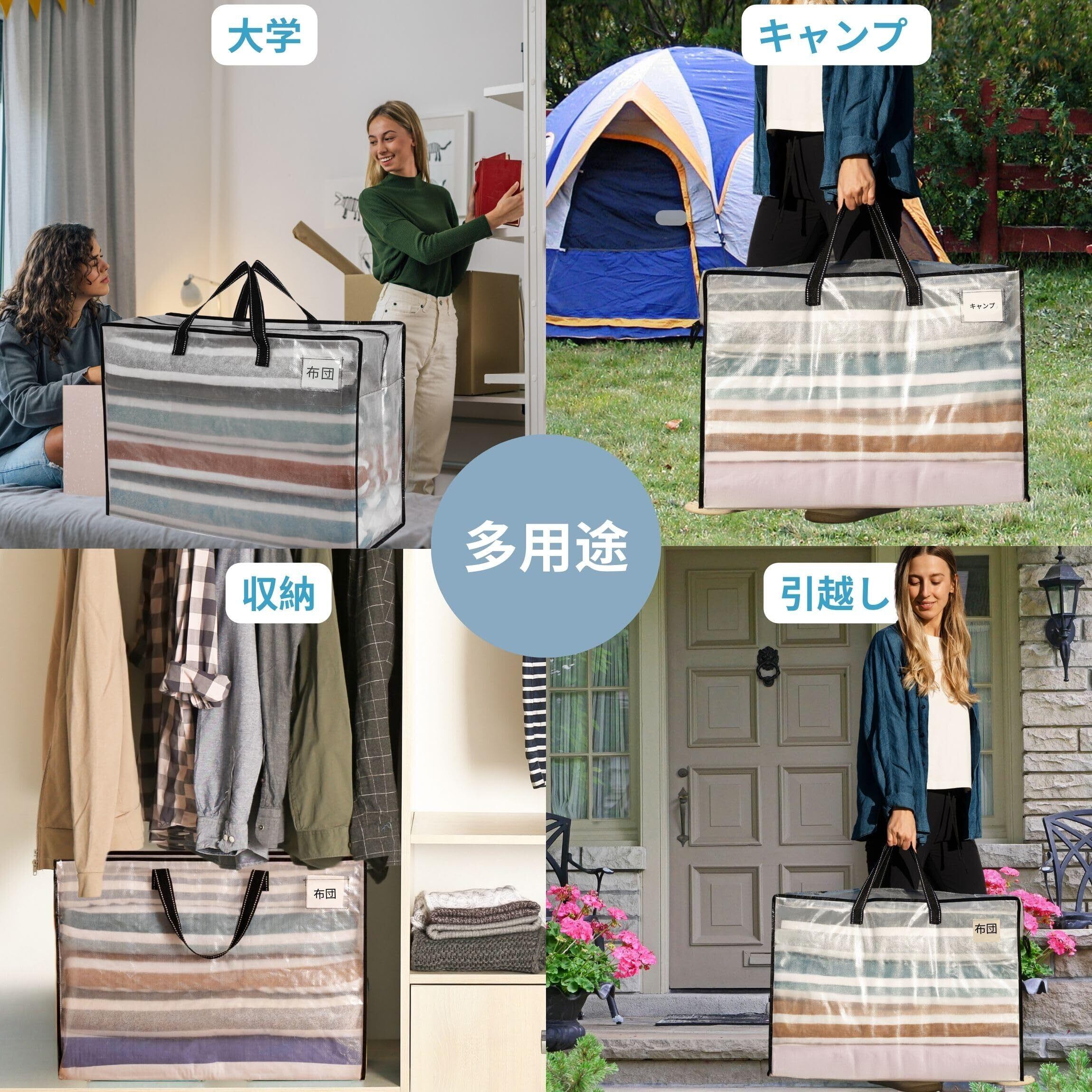 【多用途】引っ越し、収納、旅行、キャンプなど、さまざまなシーンで活躍する収納バッグです。収納ボックスや布団ケースとしても使用でき、荷物を簡単に整理してコンパクトに収納可能。夏の間に毛布や冬物衣類を収納したり、旅行中に荷物に収まりきらないお土産や追加アイテムを持ち運ぶのに最適です。小旅行の際の衣類整理やホリデーシーズンの贈り物、クリスマス飾りの収納にも便利です。