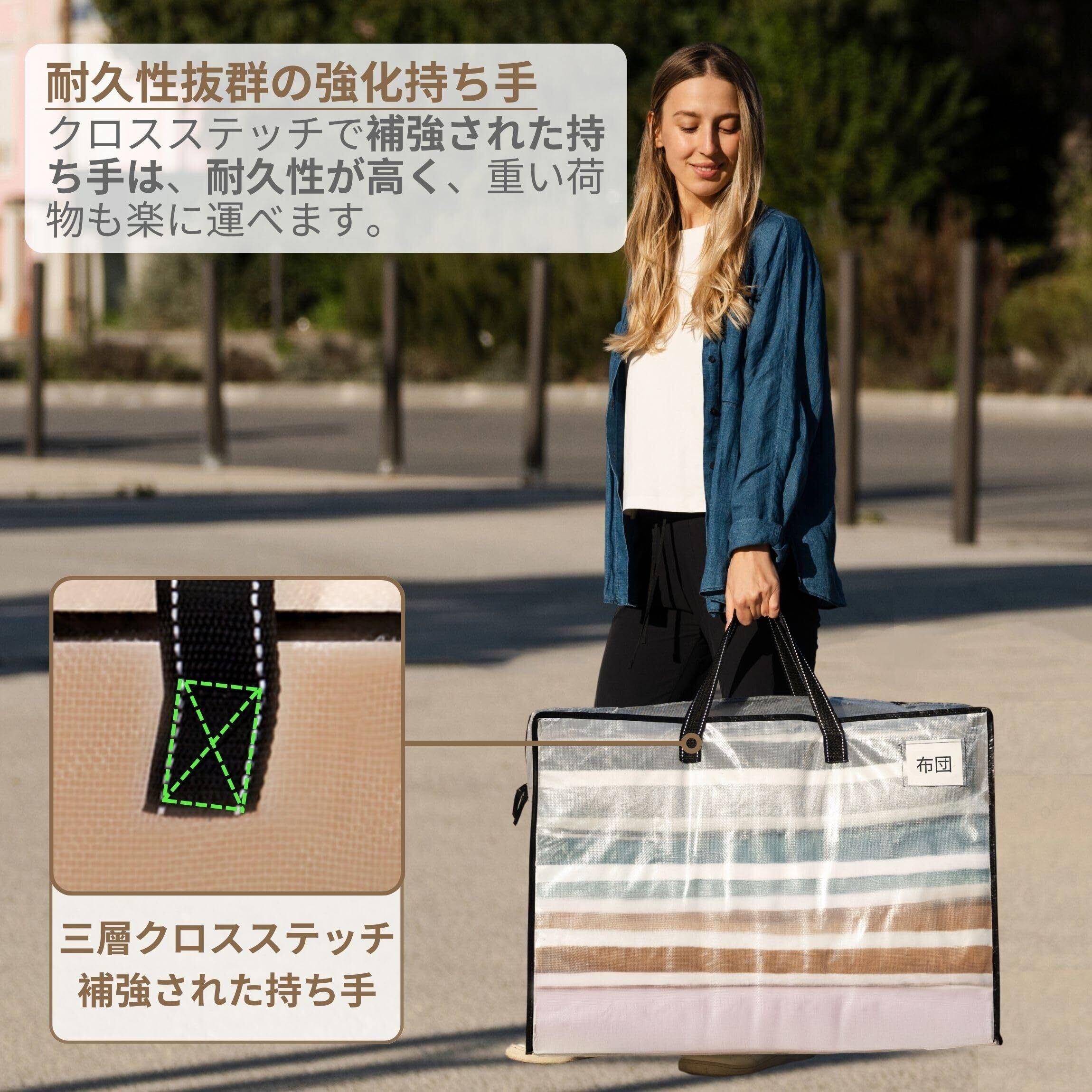 【耐水性】高品質で耐水性に優れたポリプロピレン製の織物素材を使用した布団収納袋です。耐久性があり、湿気やほこり、その他のダメージから大切なアイテムを守ります。汚れた場合は、簡単にウェットティッシュで拭き取ることができます。
