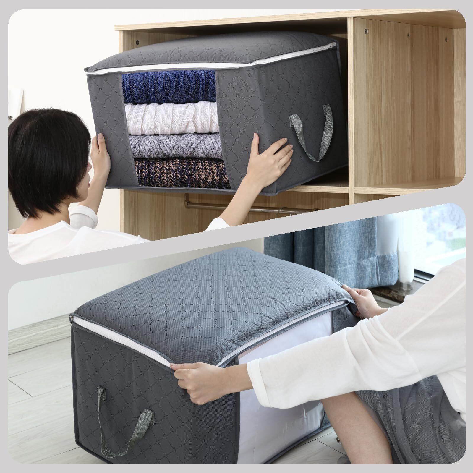 私たちの収納袋は大容量で、たくさんのものを入れることができて、90 Lの容量、例えば、枕4つ、毛布8枚、35枚ぐらいの服、布団1枚、またおもちゃ、タオル、雑然としたものを入れることもできます。雑然とした部屋をより暖かく、簡潔に、清潔にするのは、家の良い手伝いです。