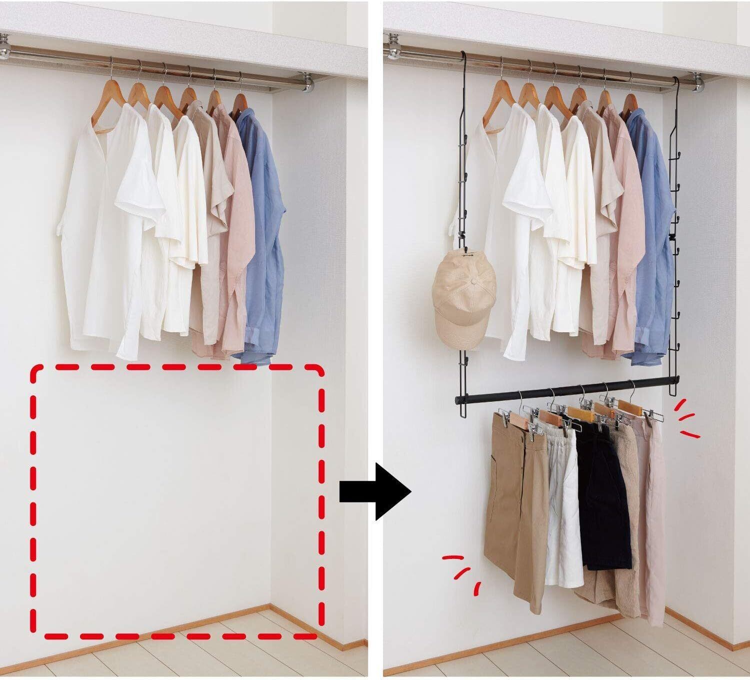 衣類の収納量アップ、吊るすだけの簡単設置。