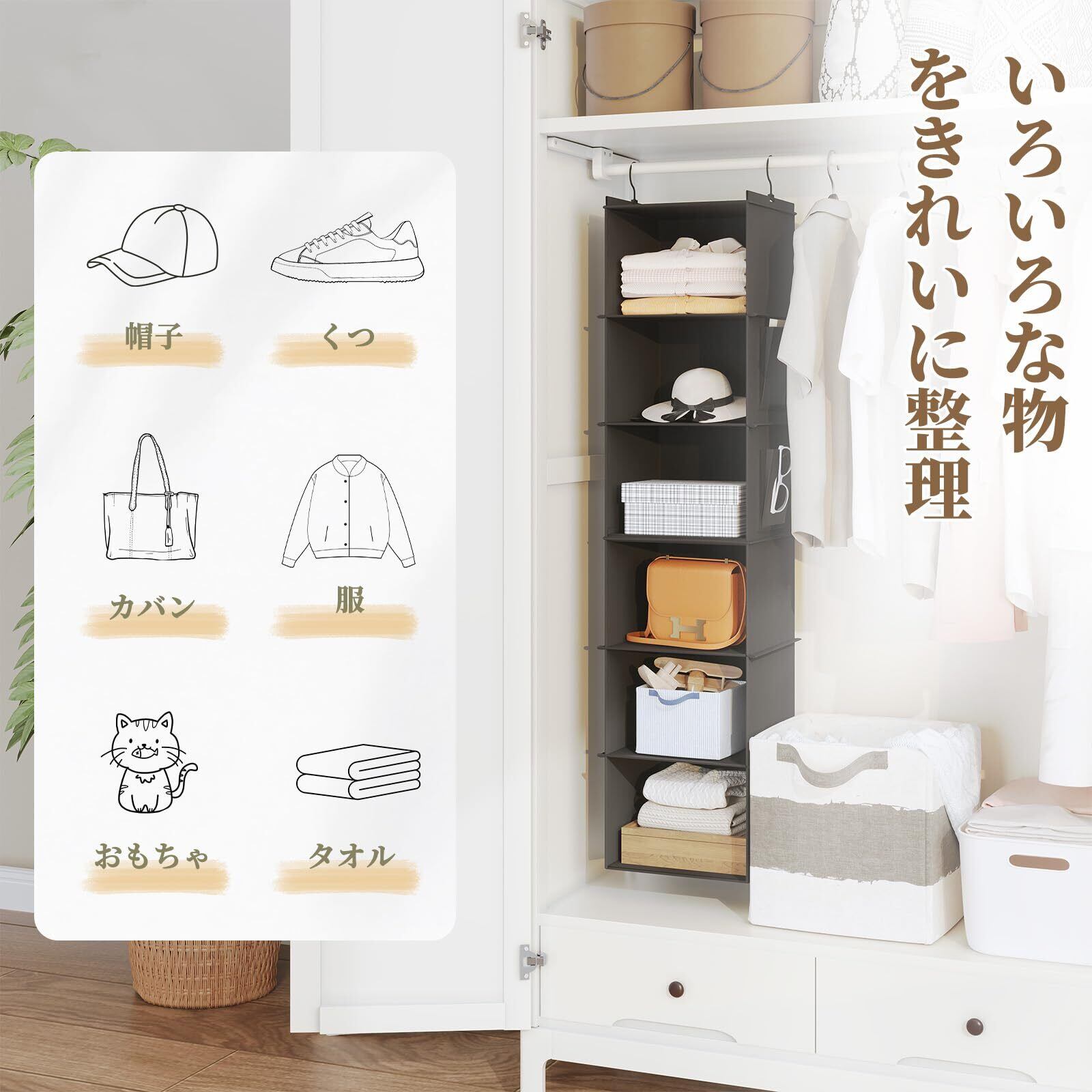 【吊り下げ・省スペース】吊り下げ式の衣類ラックで、クローゼットや部屋の収納スペースを有効活用できます。洋服だけだはなく、ぬいぐるみやタオル、カバンや帽子などのスッキリ整理整頓グッズです。