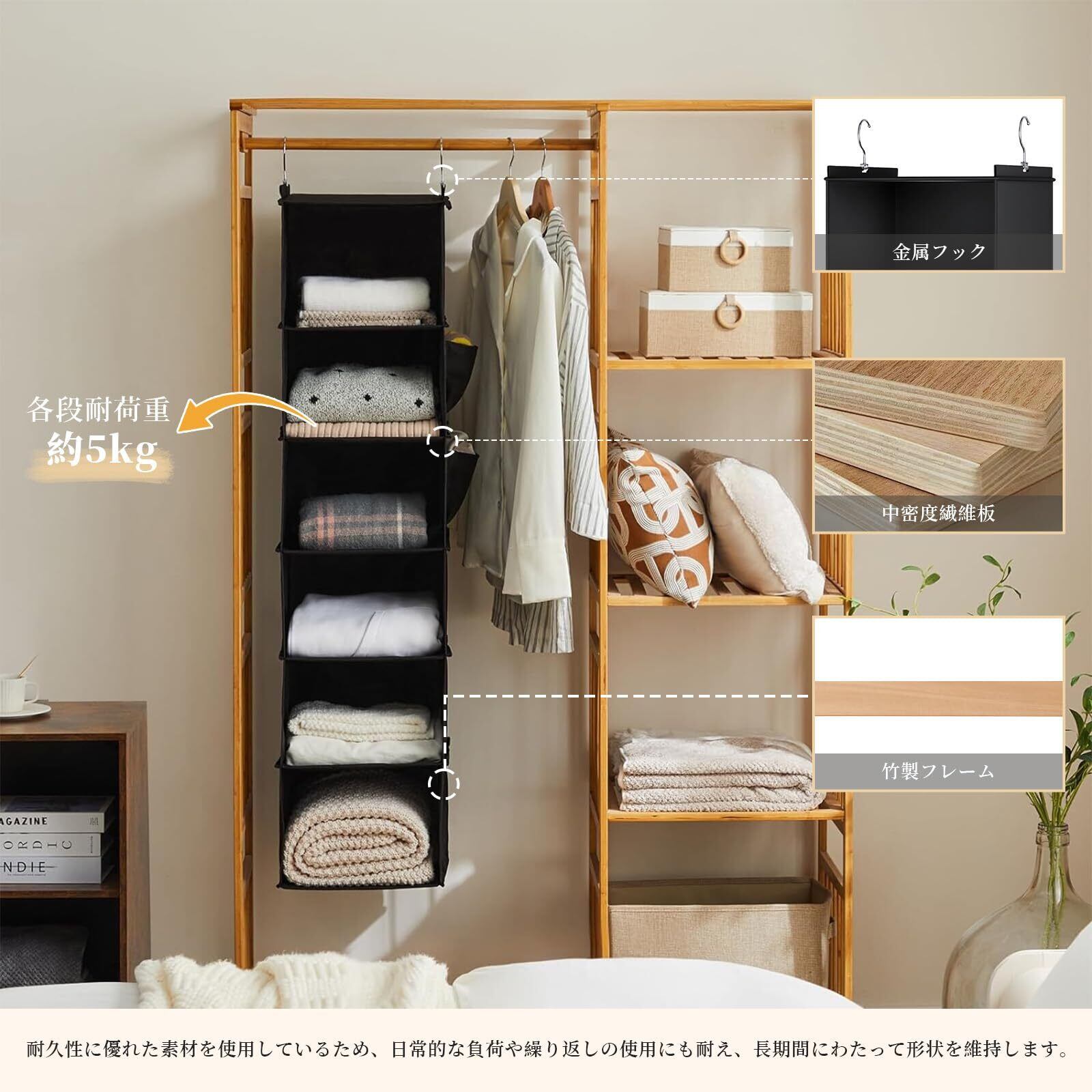 【優れた素材・長持ちする】竹製インサートとハニカムボードが入って、耐久力と荷重が強く、形が変形しにくいです。各段耐荷重5kg、大容量収納ができます。