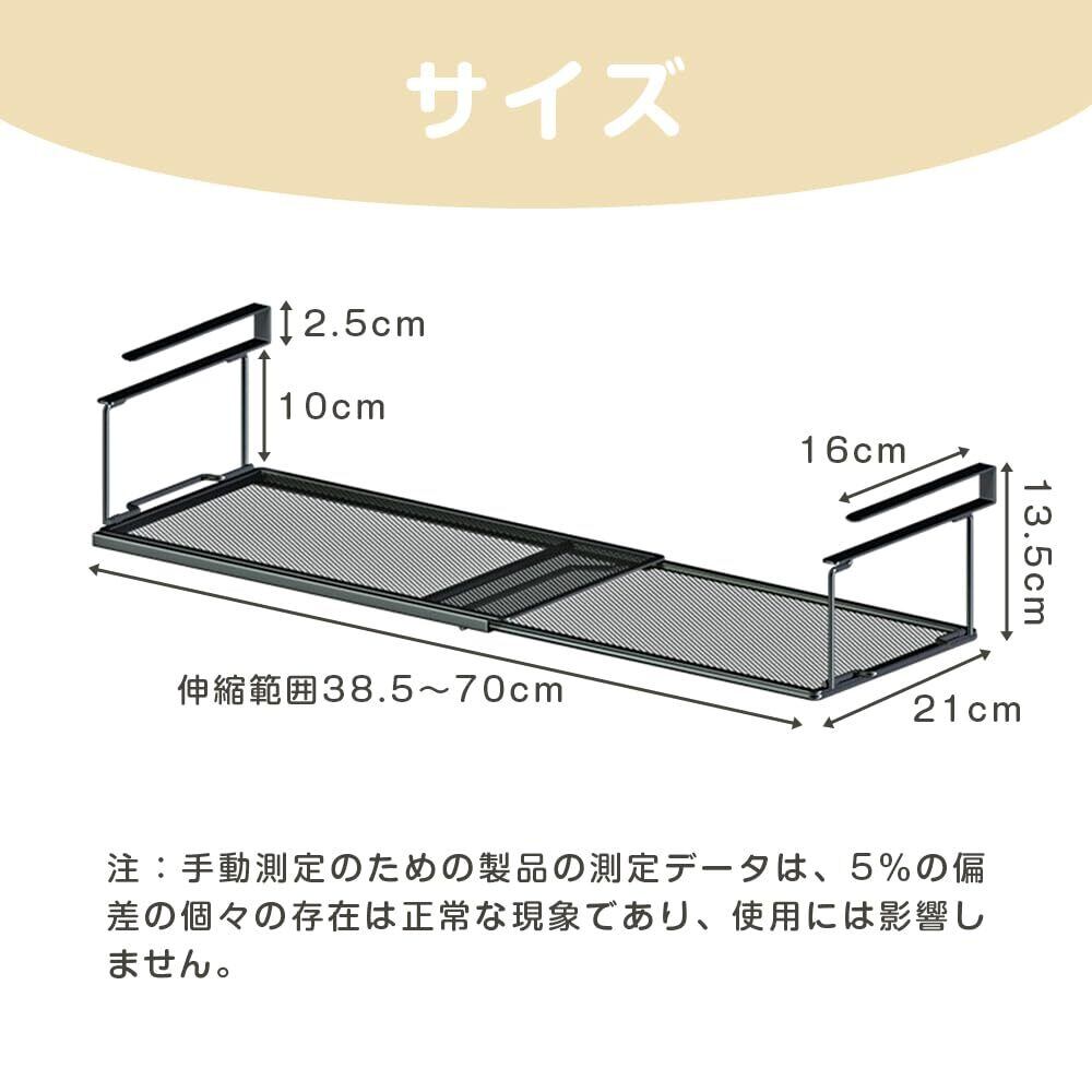 【調節可能な長さ】この伸縮式吊り下げ棚は、お好みに合わせて長さを調整できます。伸縮範囲は38.5cmから70cmまで対応しており、さまざまな収納スペースにフィットします。