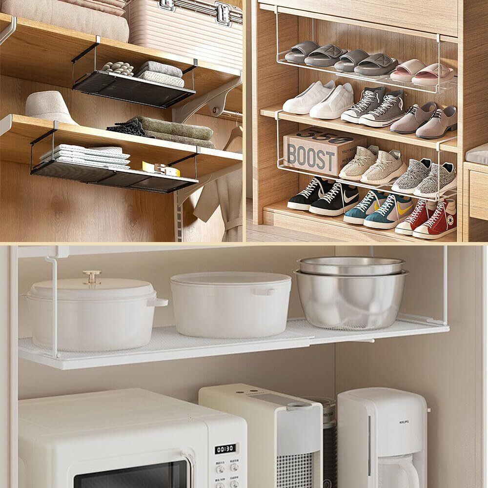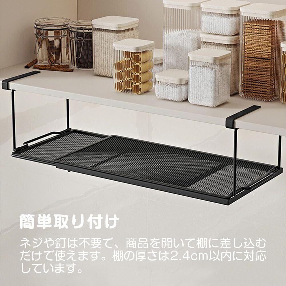 【収納拡張】戸棚下に簡単に取り付けることができるこのラックは、パントリーや下駄箱、棚の下など、あらゆる場所で利用可能です。設置が簡単で、デッドスペースを有効活用し、扉の動きを妨げることなく、キッチンやバスルーム、デスク周りを整理整頓できます。