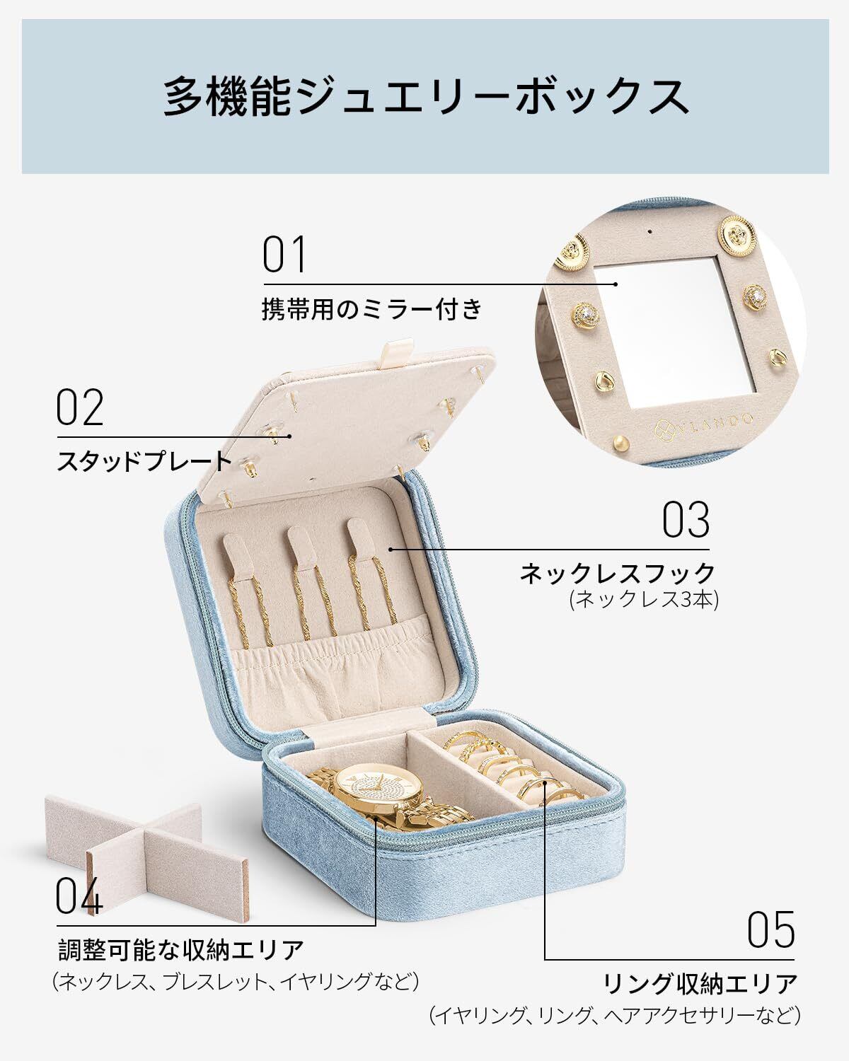 【デザイン】サイズ:幅10×奥行10×高さ5cm。このジュエリーボックスはコンパクトでスタイリッシュで、カラフルな色合いと細部へのこだわりが魅力です。 ミラーが付いているので、どこでも簡単にアクセサリーを着けることができます。 軽くて丈夫なサイズなので、バッグの中でも形が崩れにくいです。