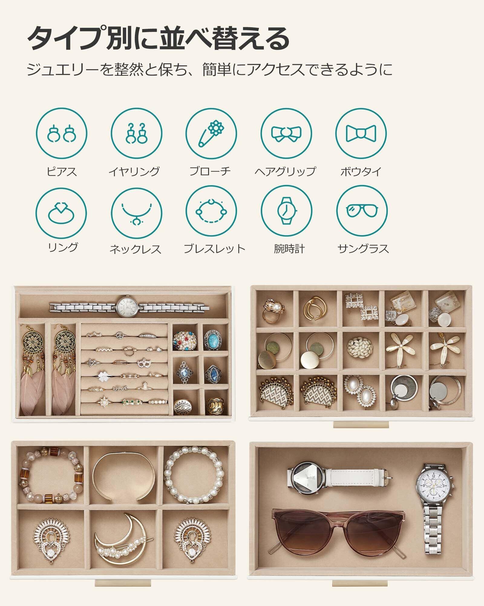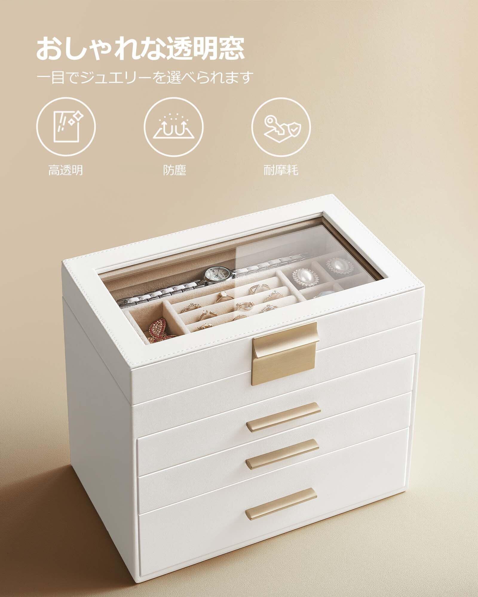 【数量限定】SONGMICS ジュエリーボックス 大容量 アクセサリーケース 4段式 引き出し 指輪、ブレスレット収納宝石箱 ガラス蓋 母の日ギフト ホワイト JBC161W01