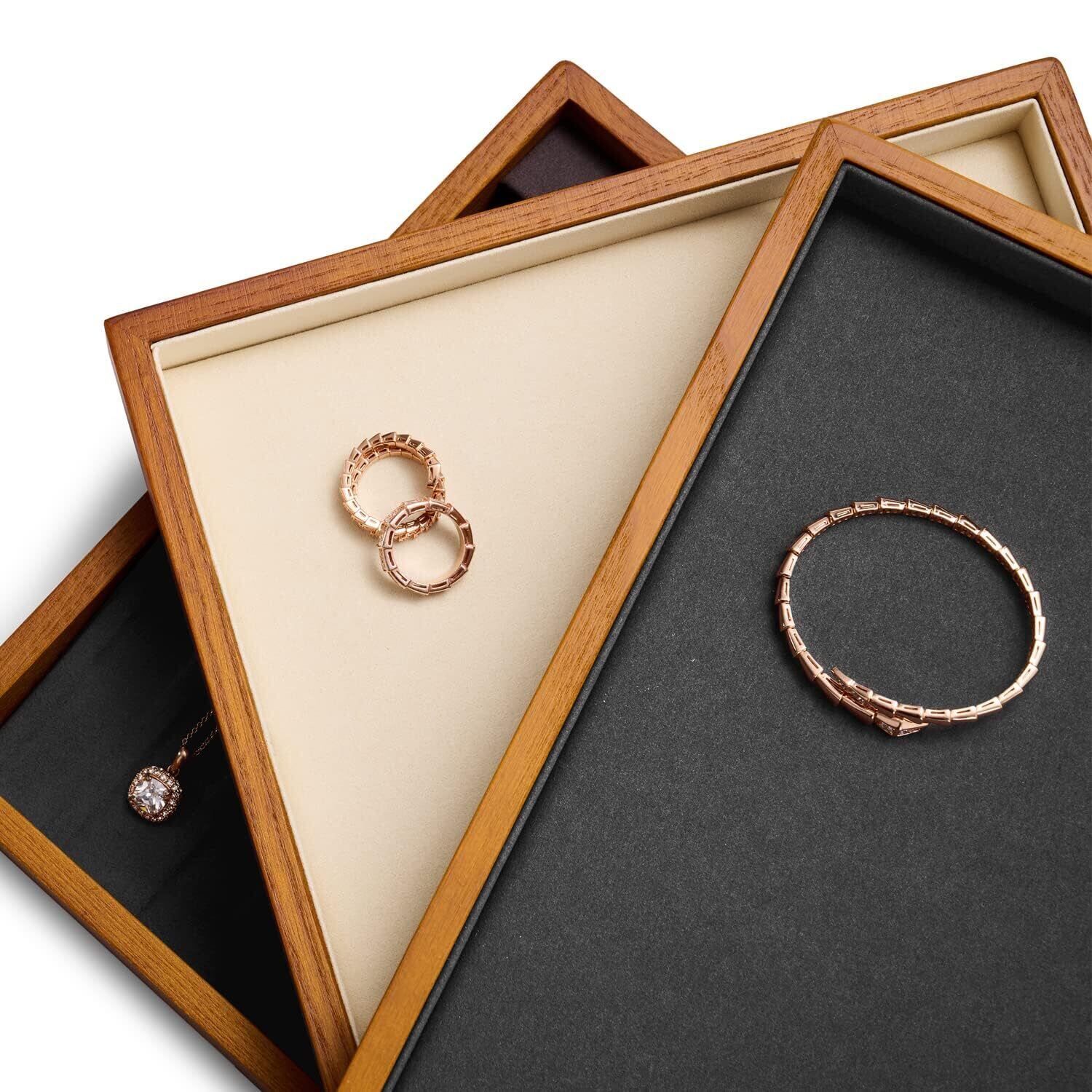 【天然木の温もりと高級感】このジュエリートレイの外装は、高級天然木材を使用しており、自然の温かみと美しい木目が魅力です。内側には高密度マイクロファイバーを採用されて、手触りも滑らかで、ジュエリーやアクセサリーを傷つける心配がありません。木材の堅牢性も高く、長期間にわたりその美しさと機能性を保ちます。シンプルなデザインは、どんなインテリアにもマッチしやすく、洗練された雰囲気を醸し出します。