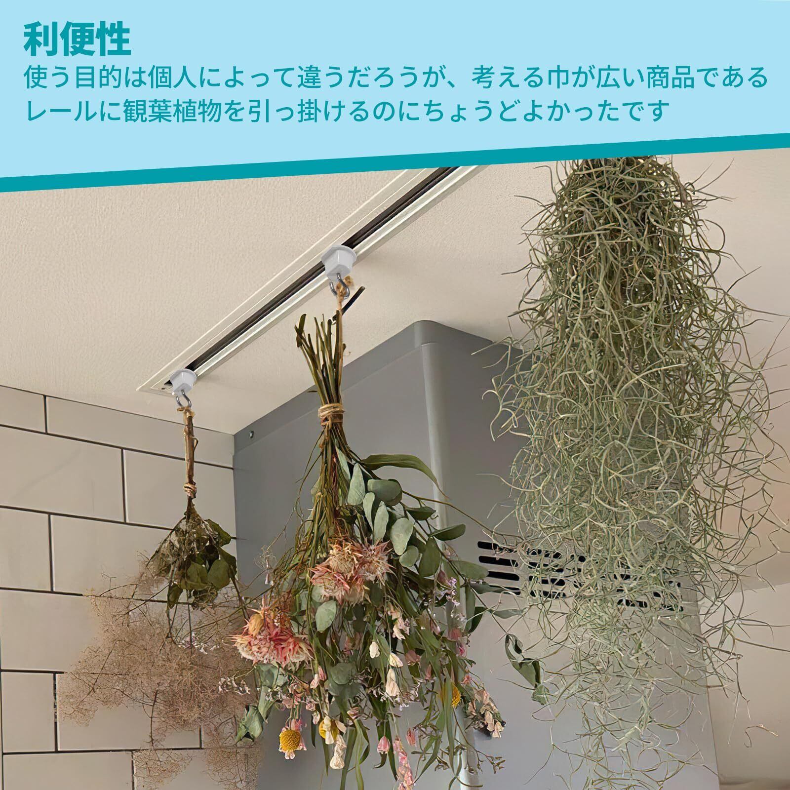 2、【特長】ダクトレールにはめて半回転させるだけなのでとても簡単に設置できます。ドライフラワーのスワッグなど軽いものを引っ掛けるのに使用しています。フックがあると色々アレンジできますし、フックにグリーンを飾ると部屋の雰囲気も変わってなかなか良いですね。