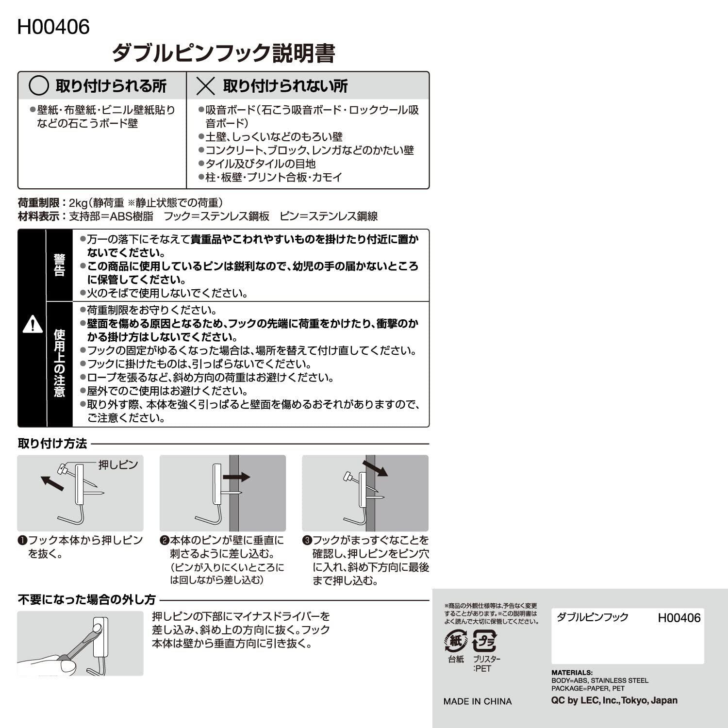 レック ダブル ピンフック 3個入 耐荷重 2kg