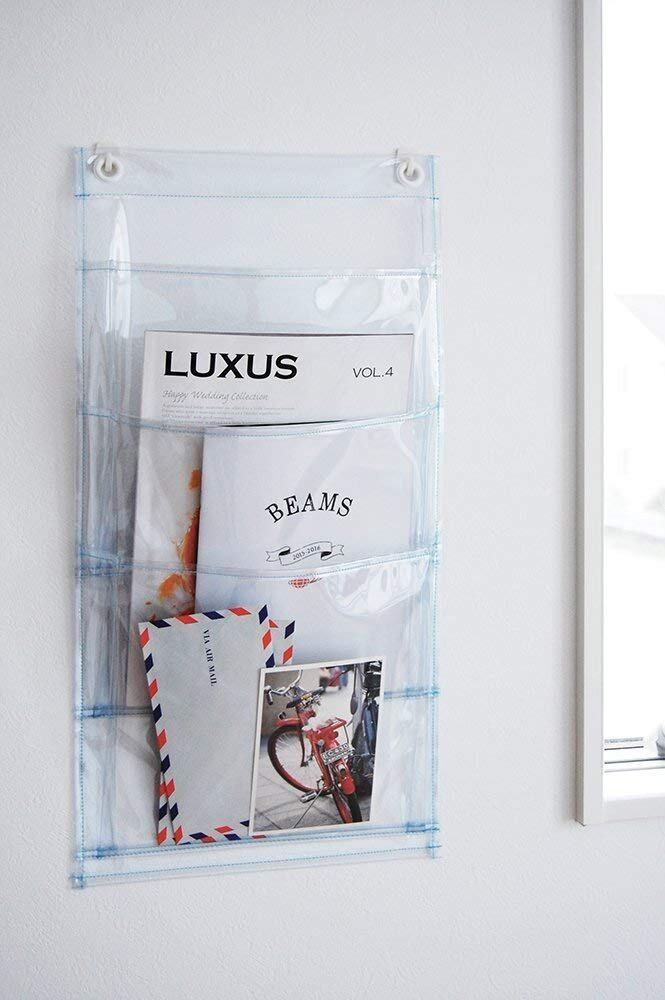 ●ポップな雰囲気のウォールポケット●台布は丈夫なクリアービニールを使用●アクセントにホワイトのハトメと水色の糸を使用●ポケットサイズ:幅26x高さ24cm