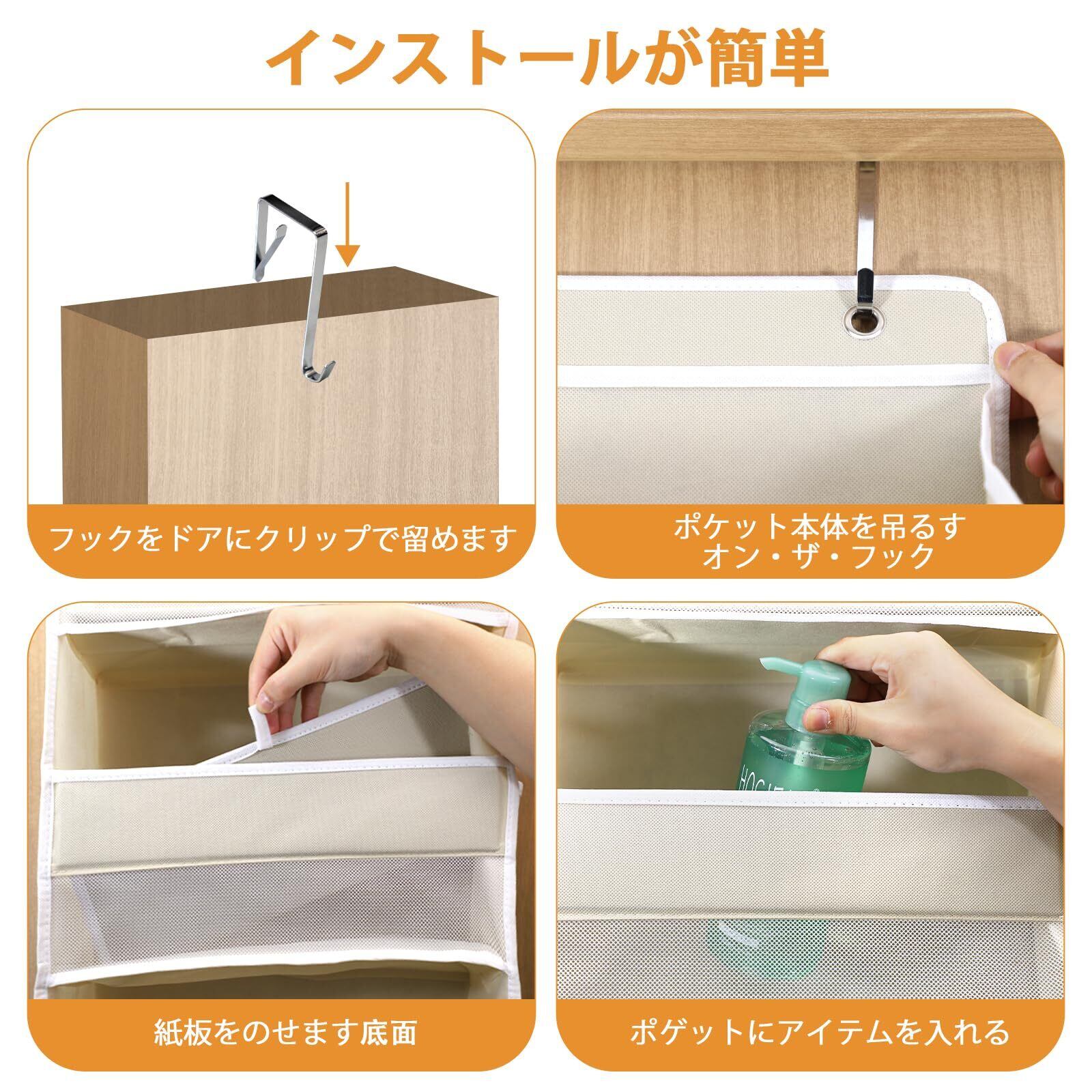 ウォールポケット,大容量吊り下げ収納 耐久性のある不織布製で、ドア収納スペースを有効活用する。2つのドア掛け用弾性フックと、側面には小型メッシュポケットが付属しています (ベージュ色, 四段)