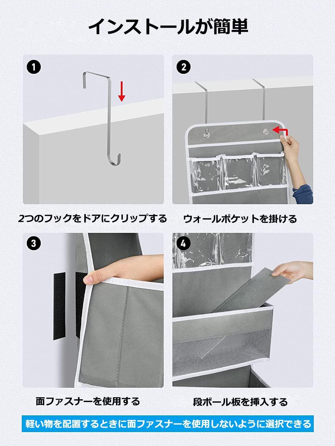 【省スペース】ドア掛け収納ポケットの4つのL字型フックでほとんどのサイズのドアやラックだけでなく、釘や壁掛けフックで壁に掛けることもできます(ご注意:ドアの厚さが4.3cm以内の場合が適しています)。使用しないときは、フックと底板を取り外して平らに折りたたむだけでスペースを節約できます。