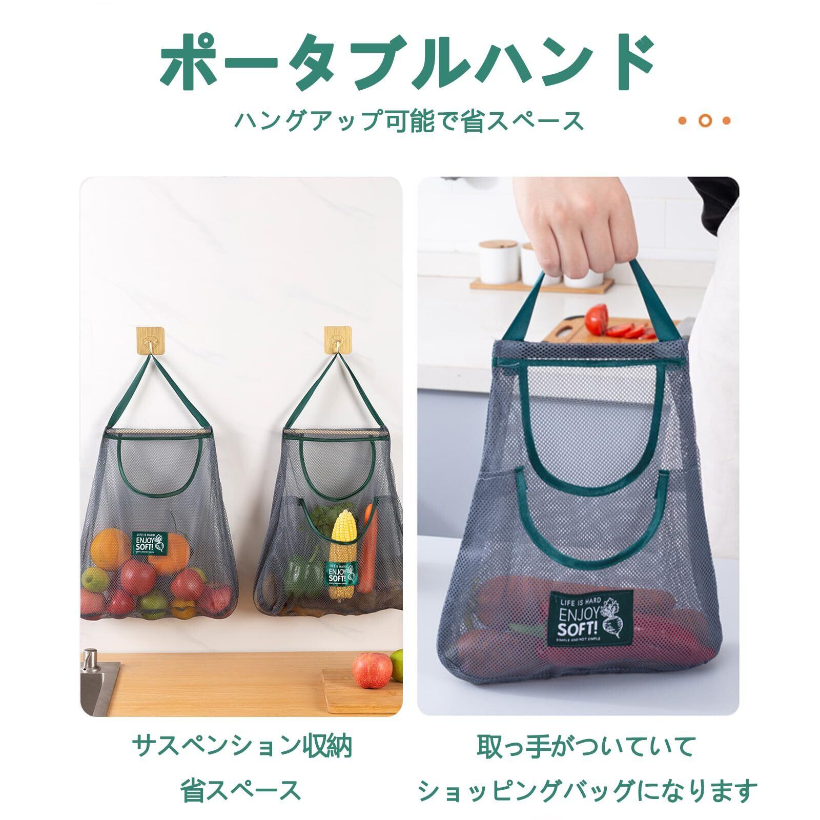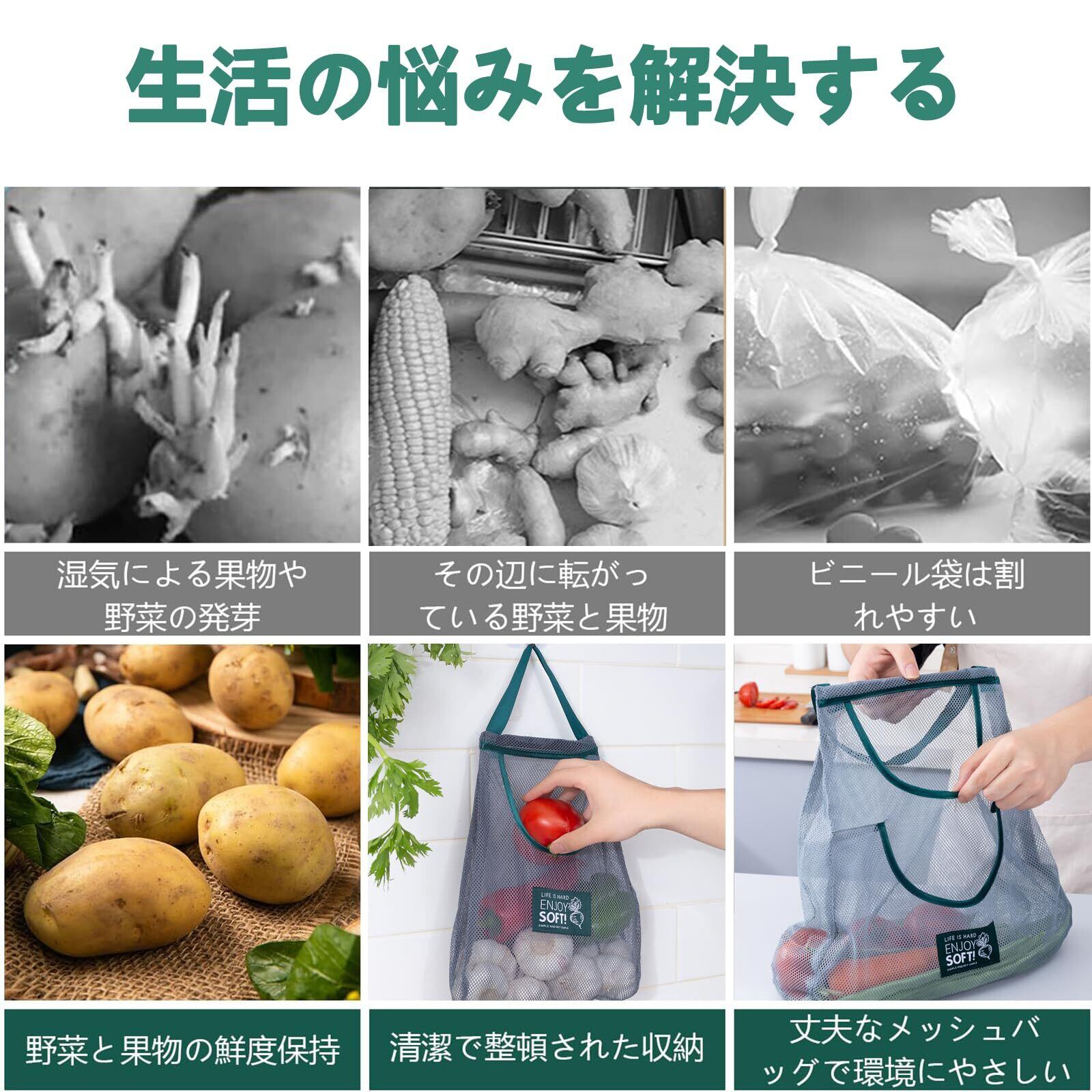【多機能応用】この野菜 吊り下げは、雑貨の保存だけでなく、小物の収納ネットバッグとしても便利です。野菜や果物、ゴミ袋、おもちゃの収納、家庭の整理にも使用できます。また、浴室の収納にも適しています。プラスチック袋ストレージは、使用済みのプラスチック袋だけでなく、各種プラスチック袋、スーパーの買い物袋、ゴミ袋、使い捨て靴カバーの保管にも使用できます。