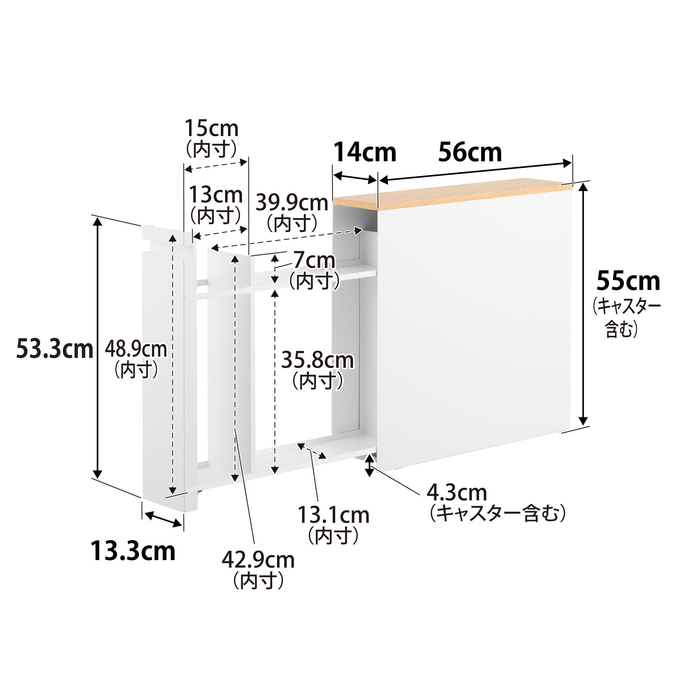 ■特徴: 幅たったの14cm!スリム&スタイリッシュな大容量の引き出し式トイレ収納ラック キャスター付きの引き出しを開けると3つに分かれた大容量の収納空間が! 長いトイレブラシも収納できます!流せるトイレブラシもホルダーごと収納可能 サニタリー用品やお掃除シート、トイレットペーパーなどを隠しながら収納 高さ55cmと低くめの設計なので手洗いカウンター下に設置も可能