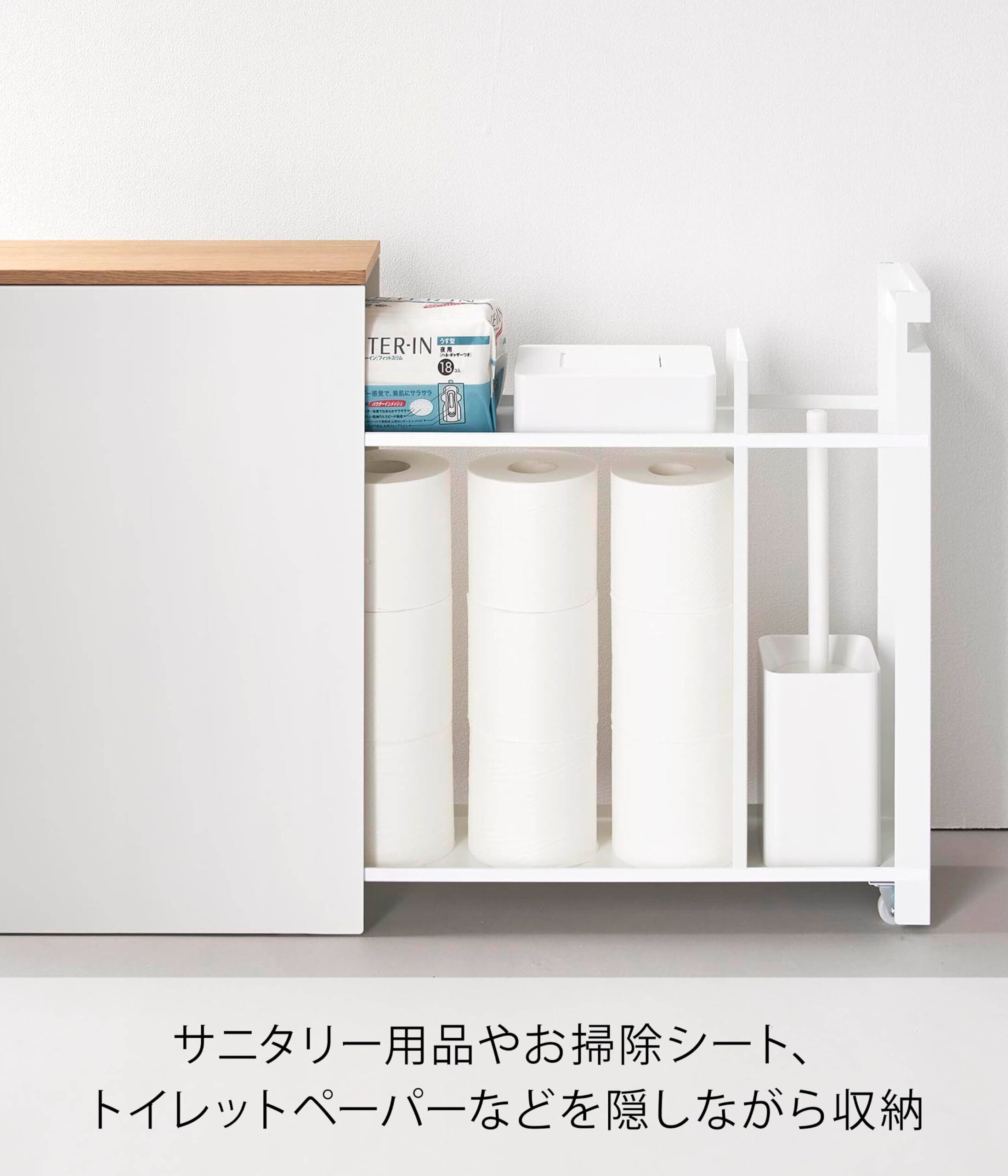 サニタリー用品やウェットティッシュ、長いトイレブラシも収納可能。