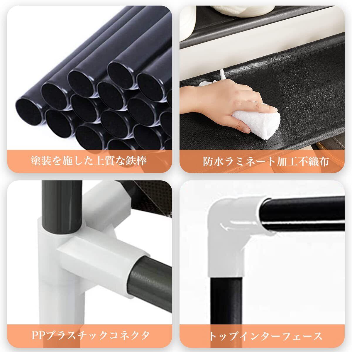 【改良版、高品質シューズラック】この靴ラックは(塗装を施した上質な鉄棒)と(防水ラミネート加工不織布)が使われています。塗装を施した上質な鉄棒は、錆びることがなく、腐食してしまうこともありません。防水ラミネート加工不織布は、防水仕様で通気性も良く、洗濯しやすく、長く使用することができます。鉄棒は、一般の亜鉛製の靴ラックと比べ、より頑丈で長持ちできます。