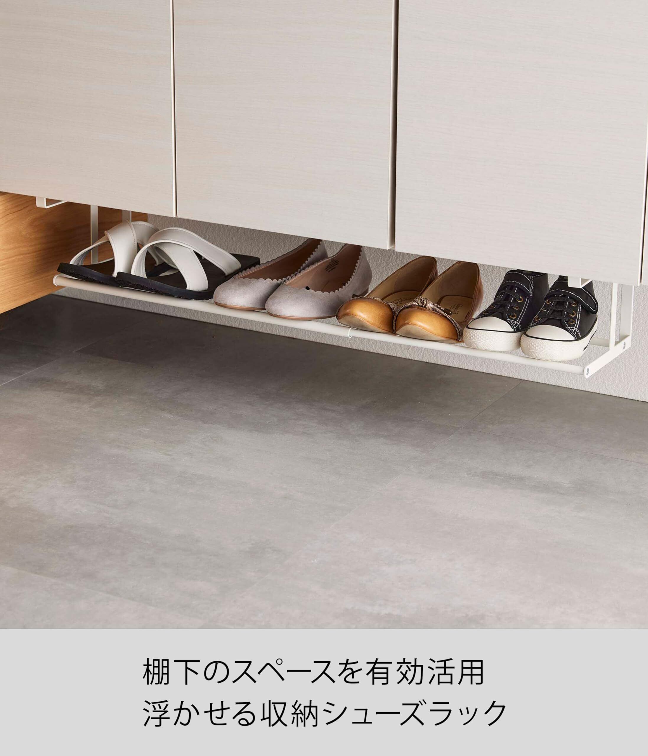 玄関の下駄箱の下に差し込むだけ! 散らかりがちなサンダルやスリッパ・ヒール靴などを浮かせて収納。掃除や来客時に便利なシューズラック。