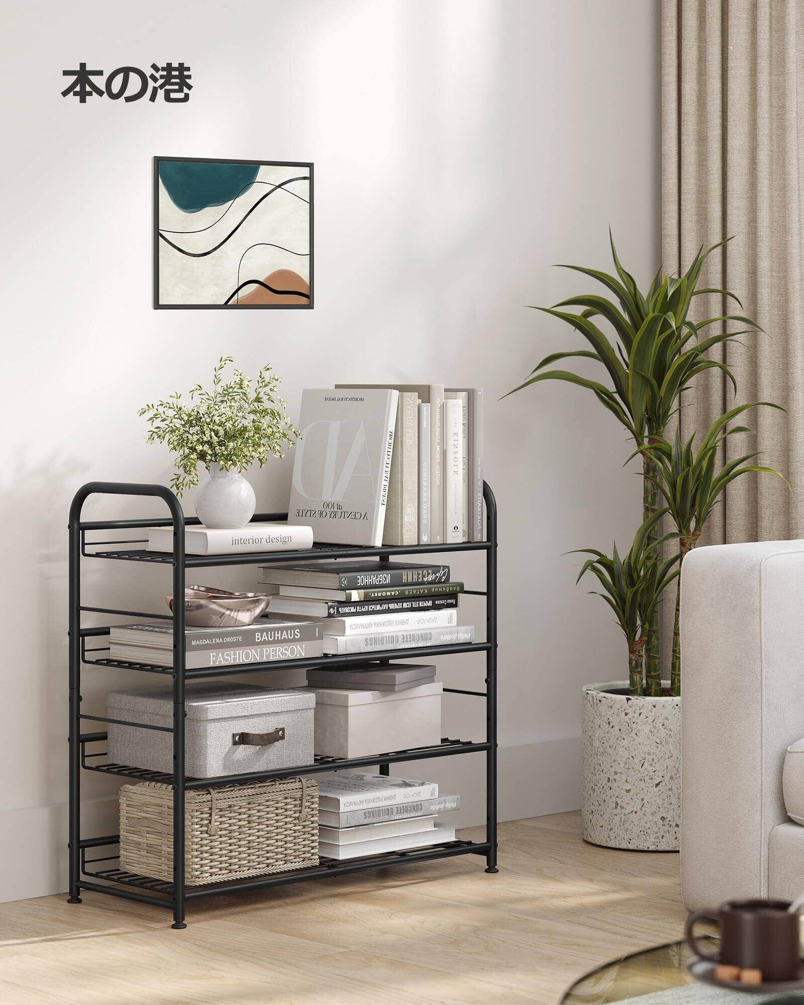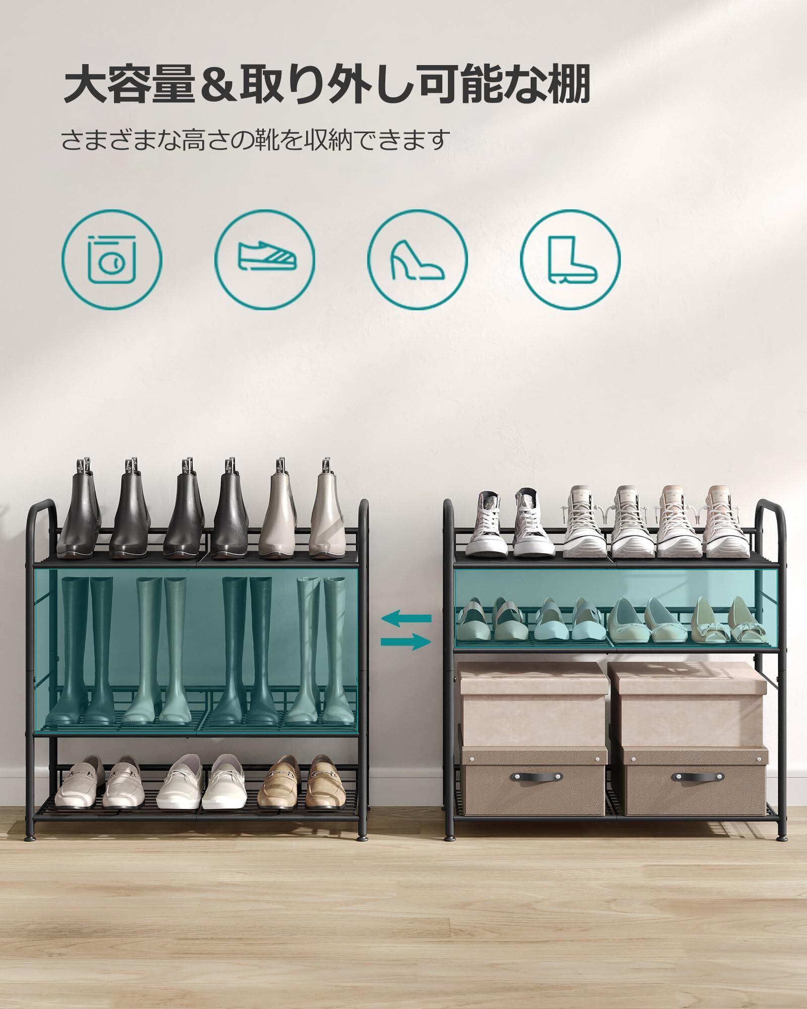 【積み重ね可能な4段階靴ラック】2セット以上を垂直に積み重ねることで、クローゼット、玄関、角に最適な12段階靴ラックを完成させることができます。さらに、ユニットを水平に橋渡しして拡張し、DIYの個人用収納を実現することもできます。