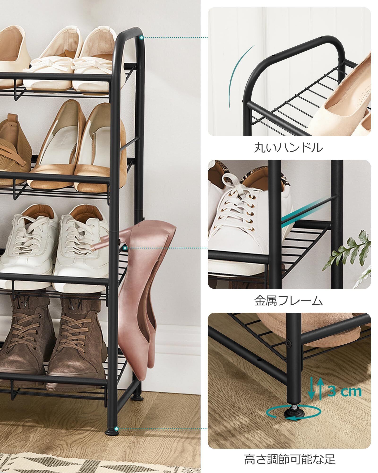 【頑丈な靴オーガナイザー】このシューズラックは、厚手の金属フレーム、ワイヤーグリッド、高さ調整可能な脚で作られており、信頼性のある安定性を確保しています。各棚に最大13.6Kgを保持し、さらに下部に追加の収納スペースがあり、3段の靴ラックには12〜16足の靴を収納することができます。