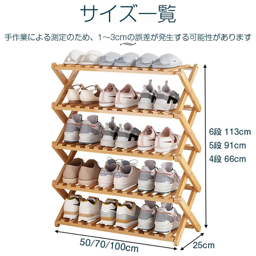 シューズラック 折りたたみ スリム 省スペース 4段/5段/6段 天然竹製 完成品 幅50/70/100cm 組立不要 靴棚 靴収納 玄関 室内 廊下 部屋 (ナチュラル, 6段-幅100cm)