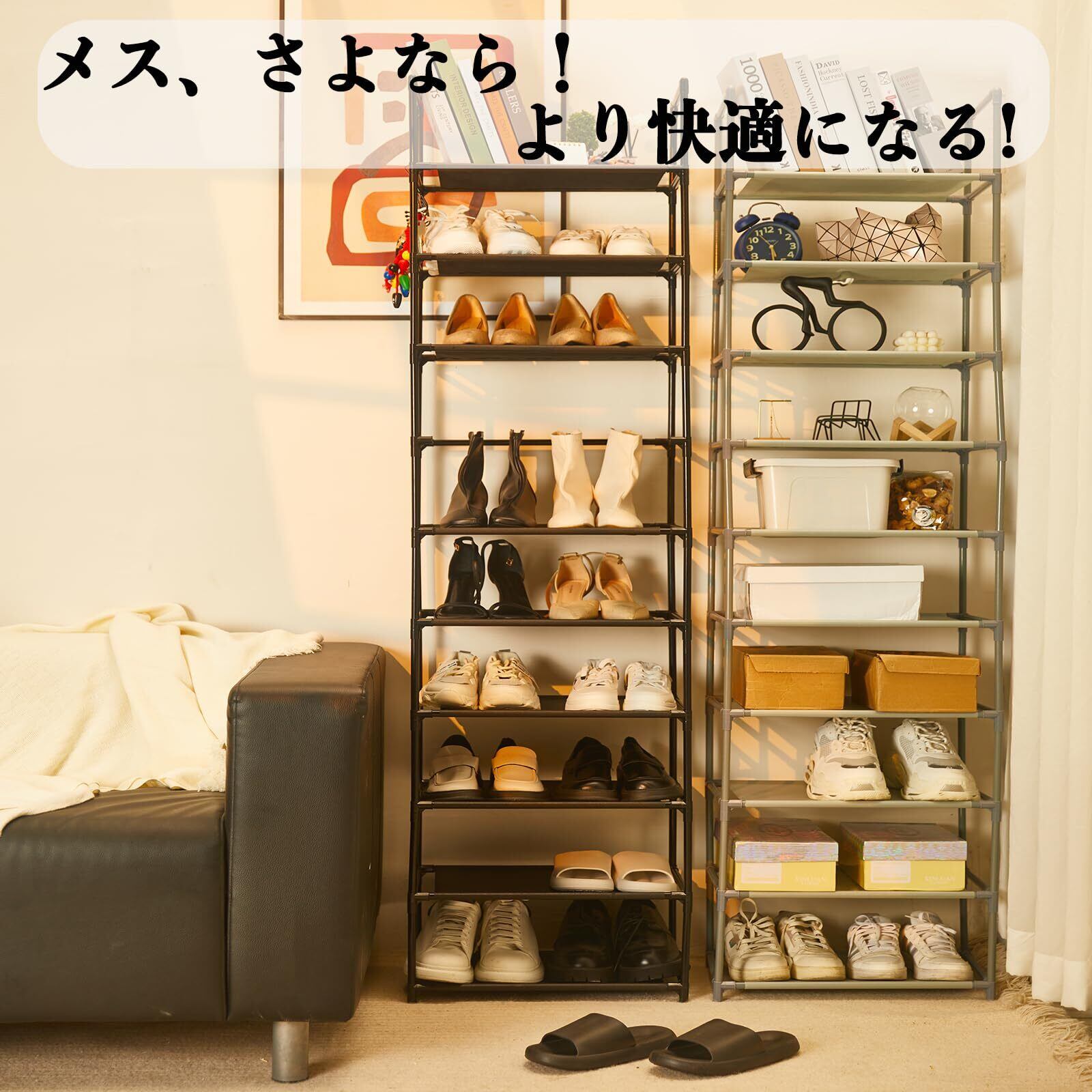 シューズラック 10段 靴収納 最新防塵版 シューズラックスリム 省スペース 進化した不織布 靴棚 寝室/玄関に靴を効率収納 靴入れ 組み立て式 幅約30×奥行30×高さ175cm(10段、ブラック)