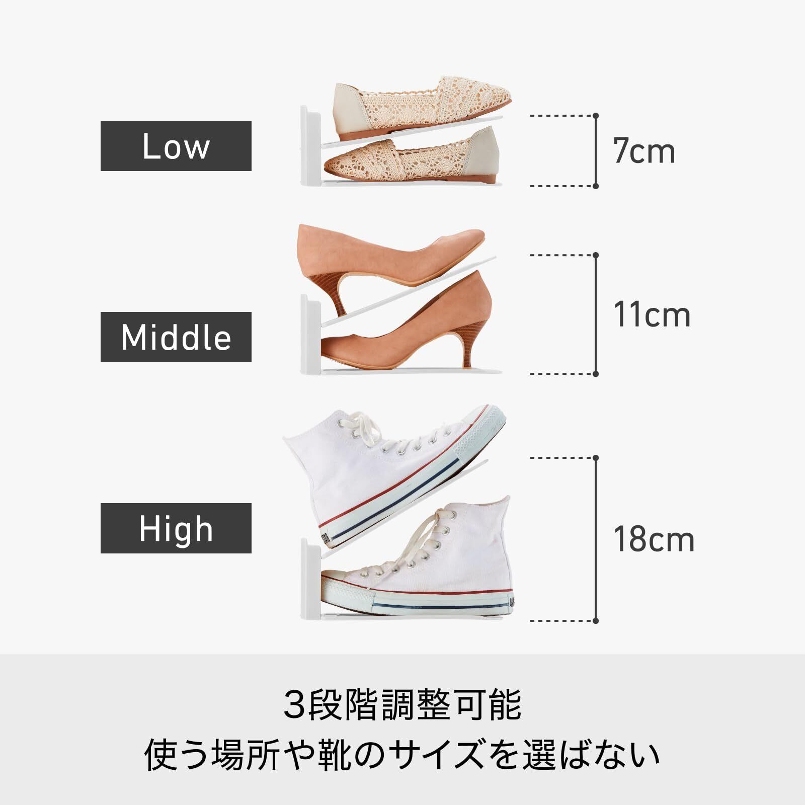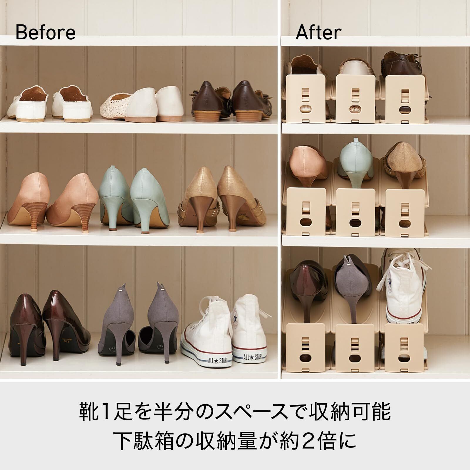 様々な靴を半分のスペースに収納できるので2倍の収納量を実現します。