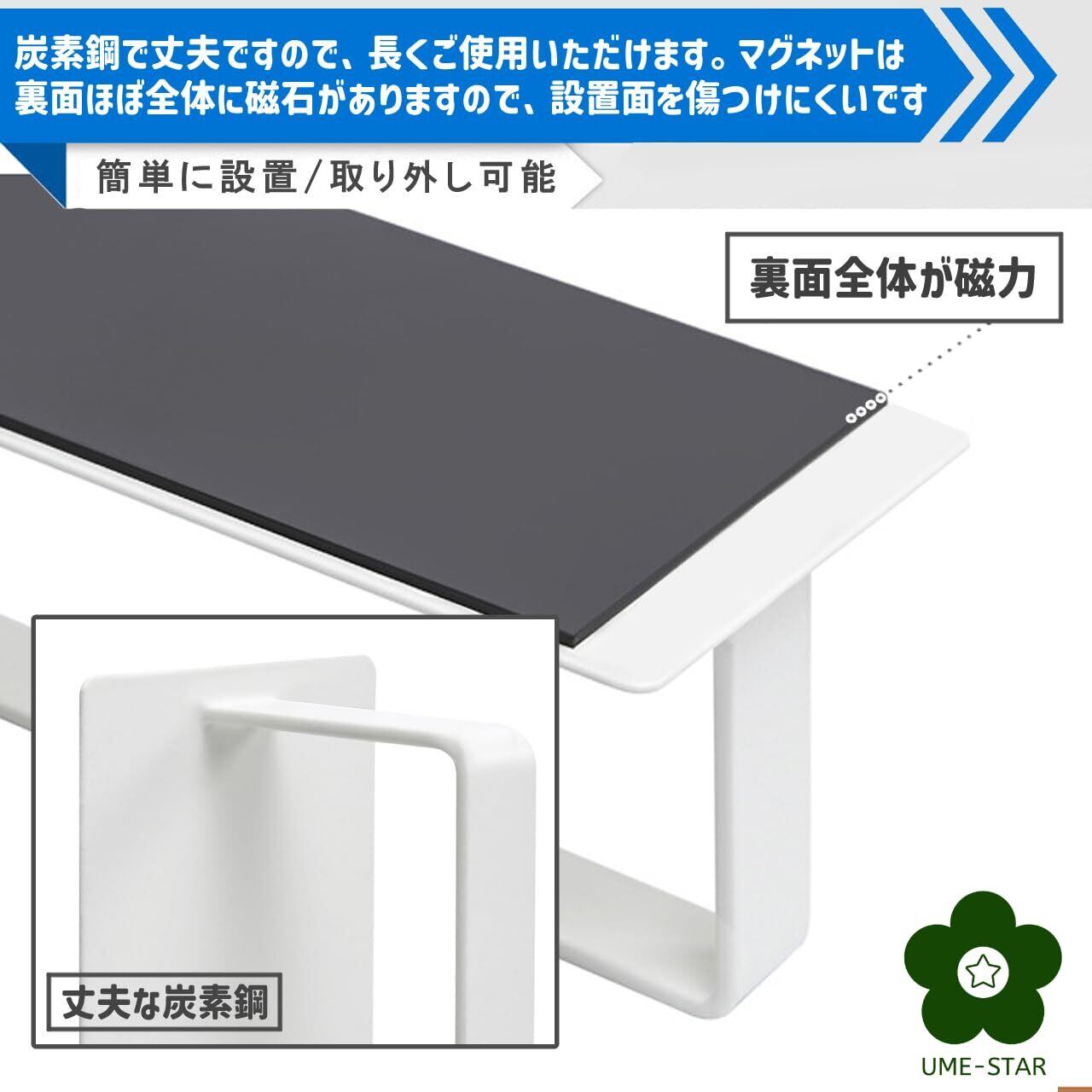 磁石式ですので、設置位置の調整や一時的に取り外しておくなどの使い方もできます。 炭素鋼で丈夫ですので、長くご使用いただけます。マグネットは裏面ほぼ全体に磁石がありますので、設置面を傷つけにくいです。