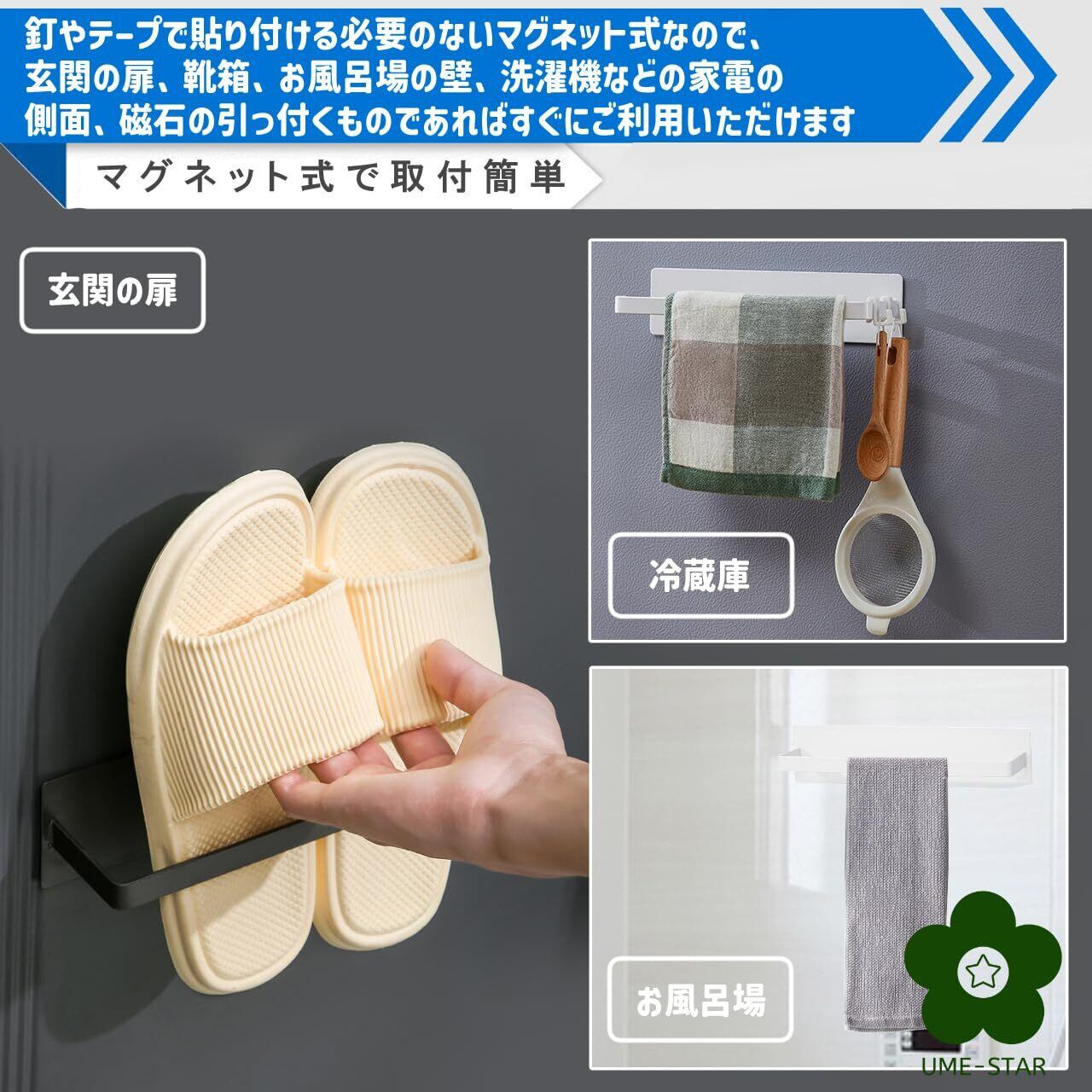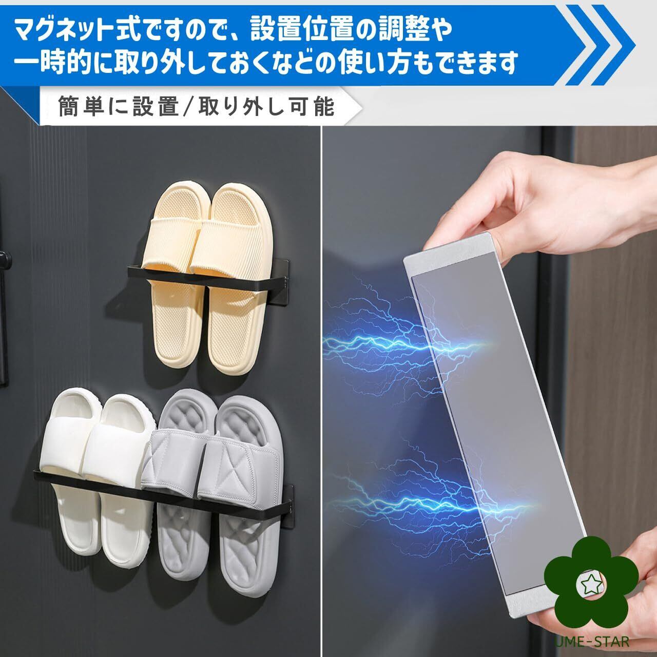 玄関のスリッパを効率よく浮かせて収納するマグネットスリッパラックです。 釘やテープで貼り付ける必要のないマグネット式なので、玄関の扉、靴箱、お風呂場の壁、洗濯機などの家電の側面、磁石の引っ付くものであればすぐにご利用いただけます。