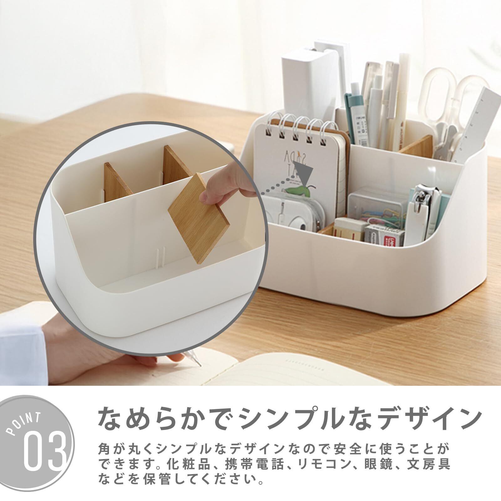 【なめらかでシンプルなデザイン】角が丸くシンプルなデザインなので安全に使うことができます。化粧品、携帯電話、リモコン、眼鏡、文房具などを保管してください。