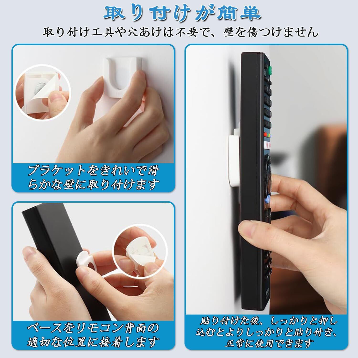 【取付け簡単&壁を傷つけない】取り付けに穴あけや工具は必要ありません、 背面のテープを剥がして、壁、ガラス、タイル、テレビ、ベッドやヘッドボードの側面などの平らな垂直面に リモコンホルダーを貼り付けるだけです、さらに、接着剤は簡単に剥がすことができ、跡が残りません