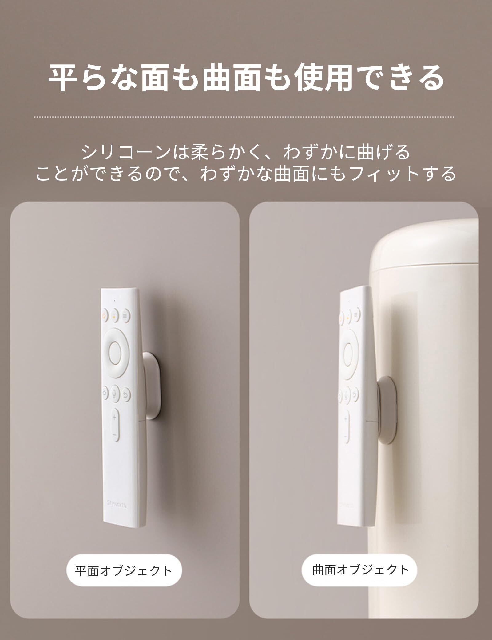 【革新的磁気吸引設計】磁気リモコンスタンドには強力な磁石とカードスロットが付いており、リモコンをしっかり固定し、リモコンの落下を防止することができる。 【磁石吸着】このリモコンスタンドには吸引力の高い磁石が搭載されており、リモコンを近づけると吸着して戻ってくる機能で、リモコンの整理が簡単になり便利になります。 【コンパクトでスタイリッシュ】重量:わずか12 g、サイズ:43*26*10 mm、コンパクトでスペースを占めません。シリカゲル製の筐体を採用し、外観はスタイリッシュでシンプルで、部屋の雰囲気を損なわず、どんな家にも適しています。 【取り付け簡単】ドリル不要、工具不要。背面ゴムをはがすだけで、リモコンスタンドは壁、ガラス、タイル、ベッドサイドなどの平らで垂直で滑らかな表面に取り付けることができます。 【幅広く適用】フォトフレーム、ファンリモコン、エアコンリモコン、Apple TVなど、さまざまなサイズのリモコンに適しています。アイデアを発揮して、必要なものをぶら下げます。家庭、賃貸者、オフィス、学校、商店の理想的な選択であり、スペースと時間を節約するために整然としています。