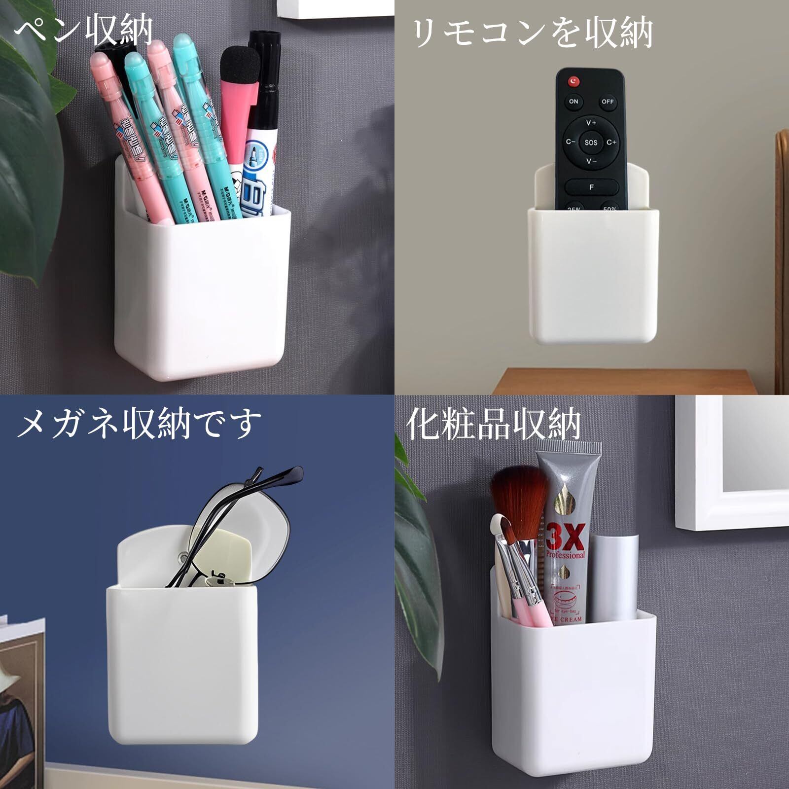 【壁掛け式リモコンホルダー】壁掛け式なので、スペースの節約に効果的なオーガナイザーです。 化粧品やリモコン、携帯電話、メガネ、文房具など、テーブル周りの小物を収納することができます。好きなものを好きなだけ収納でき、すっきりと片付いた洗練されたシンプルライフを楽しめます。