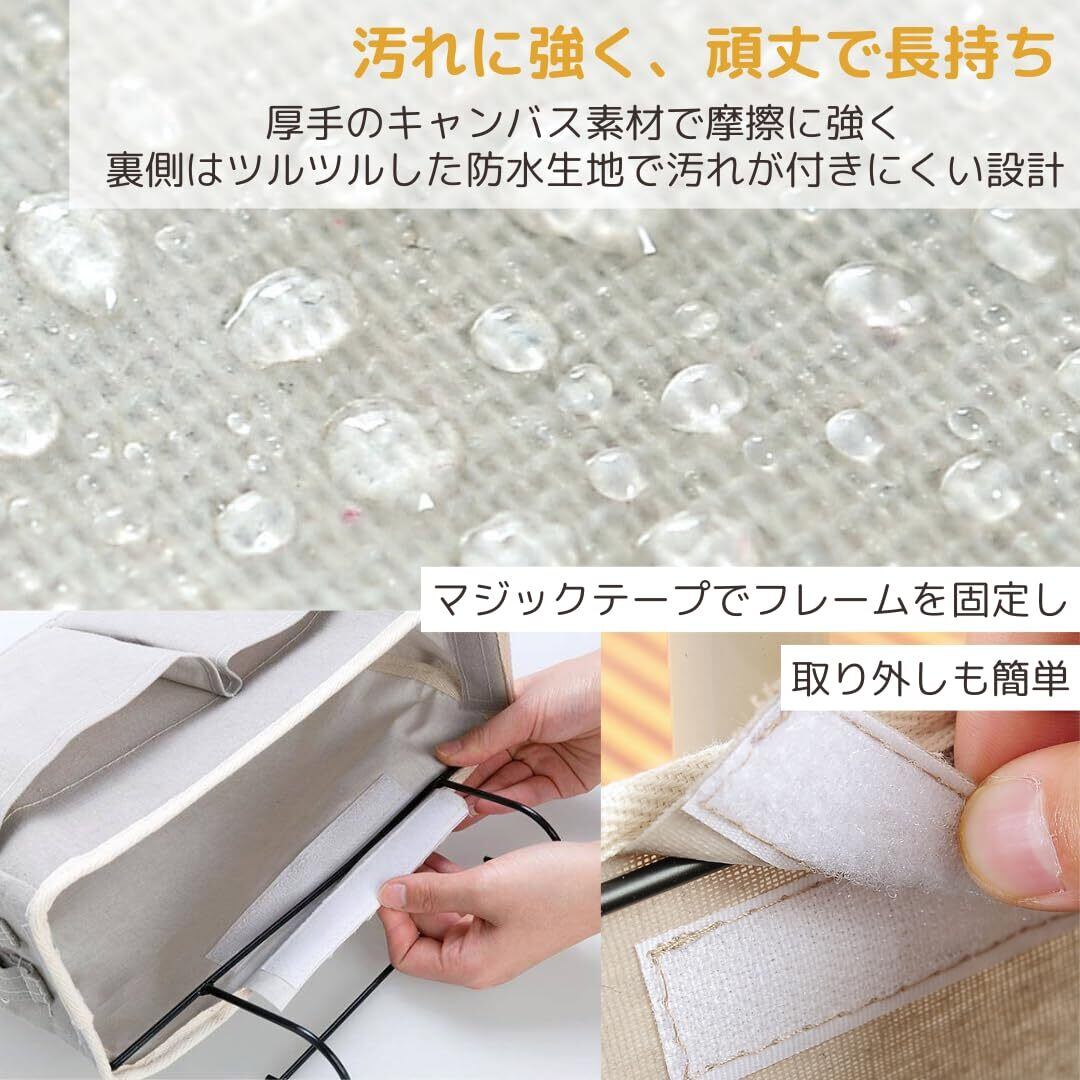【汚れに強く、幅広い場所に対応】厚手のキャンバス素材で摩擦に強く、裏側はツルツルした防水生地で汚れが付きにくい設計。鉄製フレームは頑丈で、ベッドや椅子の背もたれ、ベビーカー、キャビネットの扉など、幅4.5cm以内の場所ならどこでも簡単に取り付け可能です。マジックテープでフレームを固定し、取り外しも簡単。