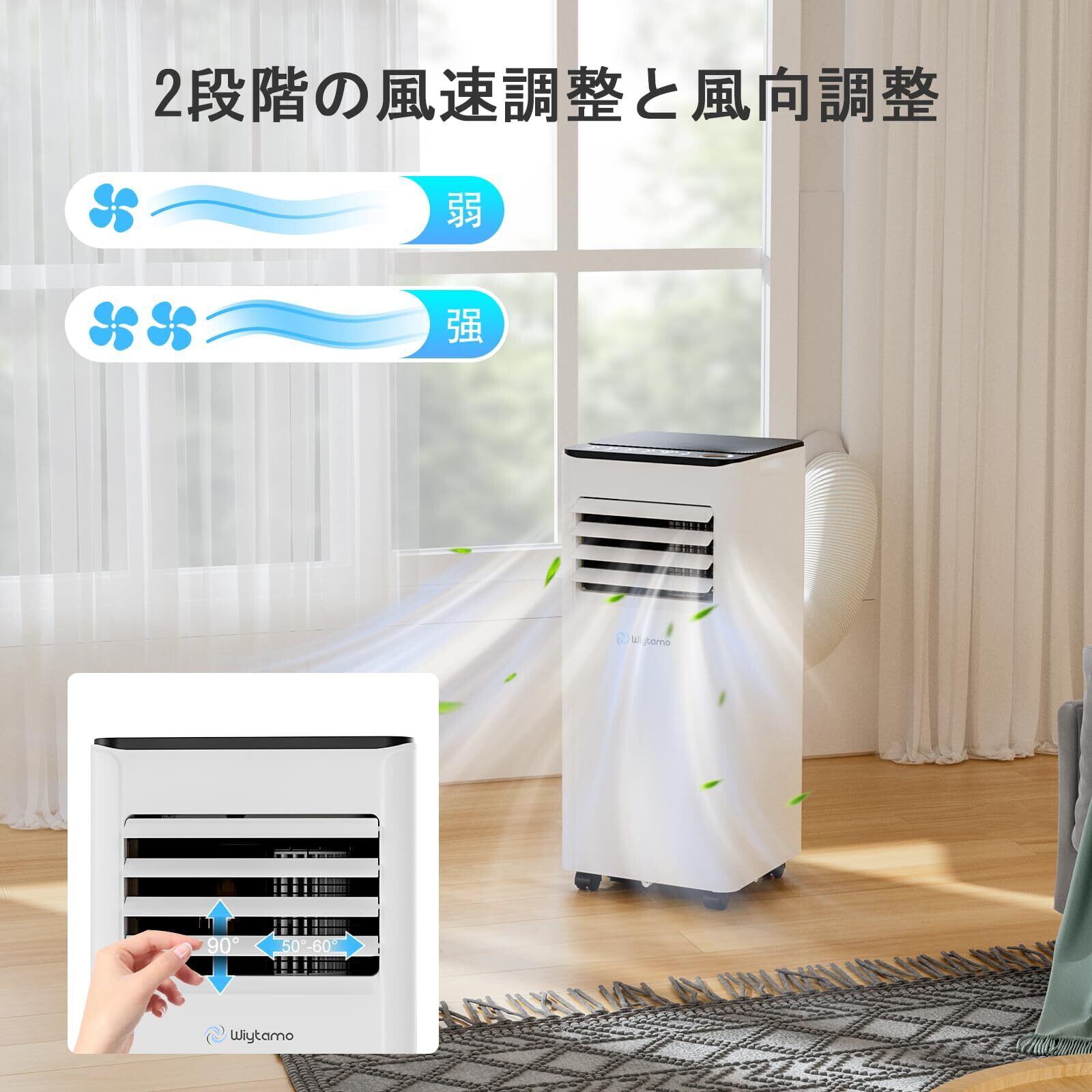 【2段階の風量設定&24時間タイマー機能】Wiytamoクーラーは、風量を強弱2つのモードで切り替え可能で、上下左右に風向を自由に調整できます。部屋全体をムラなく冷やすことができ、さまざまなシーンで使用に適しています。さらに、最大24時間まで設定可能なタイマー機能が搭載されており、夜間の冷やしすぎを防ぎながら、省エネ運転を実現します