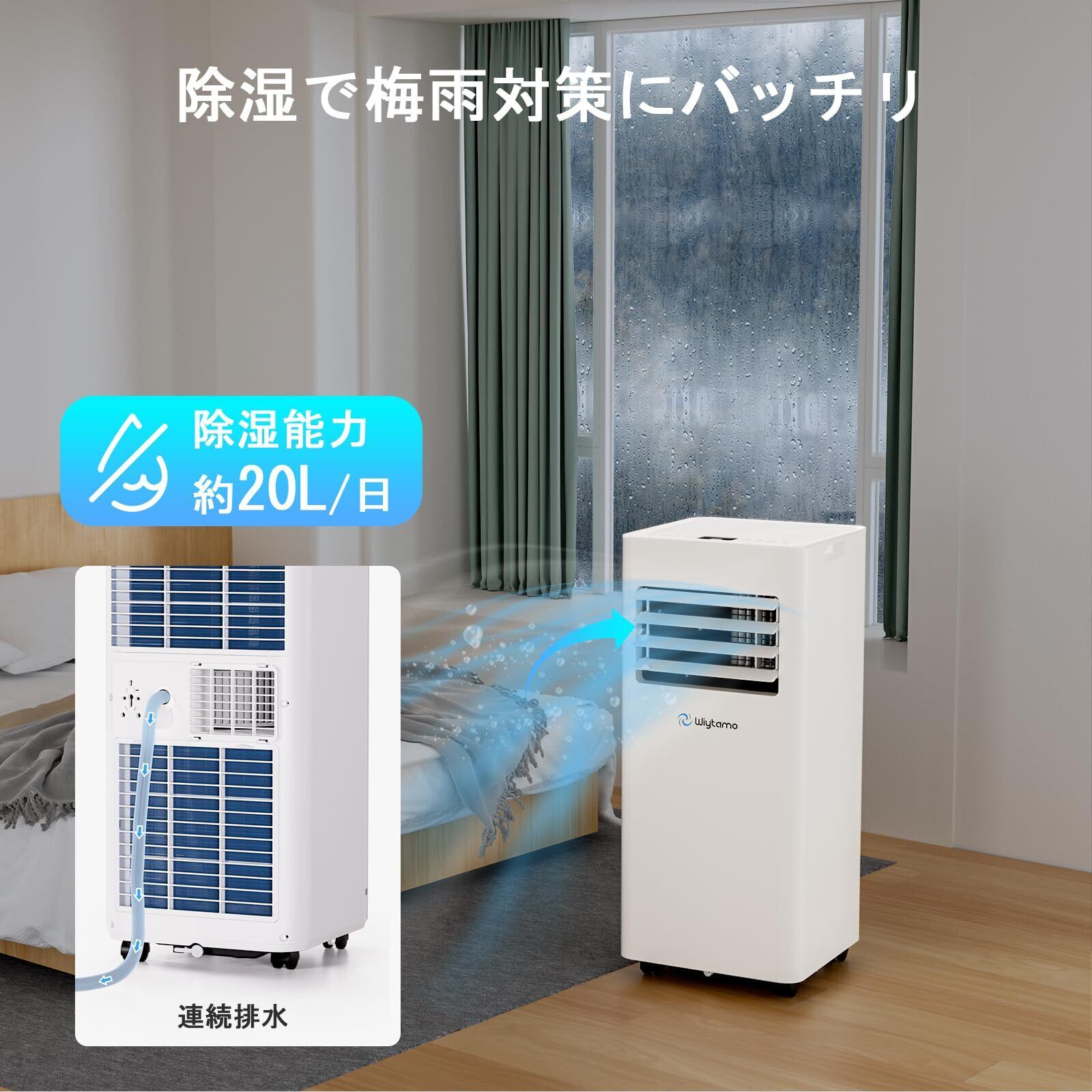 【1日20Lの除湿能力&効率的な排水システム】Wiytamoスポットクーラーは、50Hzで18L/日、60Hzで20L/日という高い除湿性能を備えています。湿気の多い梅雨の時期でも、室内環境をドライに保つのに最適です。また、調整可能な風向と2段階の風速モードにより、冷気を効率よく循環させることができます。さらに、自己蒸発機能と排水ホースによる連続排水により、水タンクの頻繁な清掃が不要になります