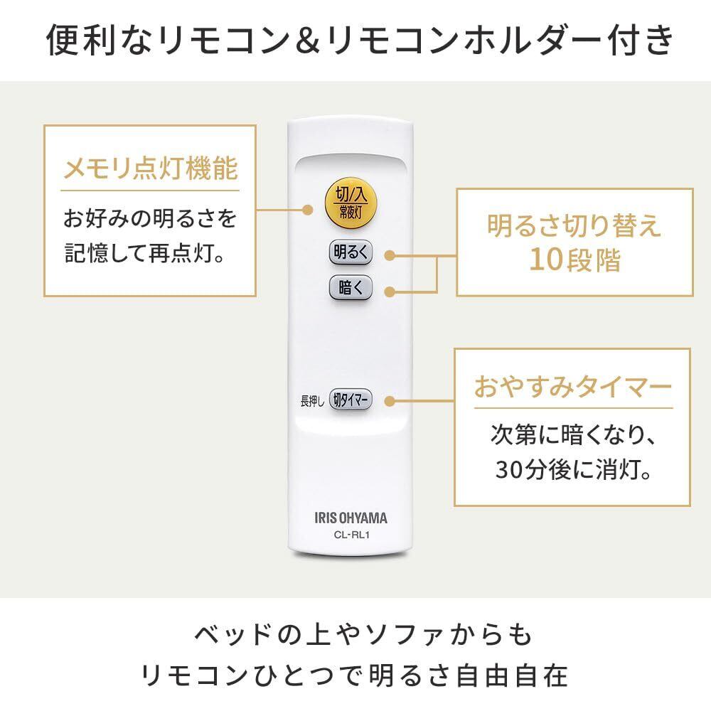 適用畳数:~6畳 / 定格電圧:AC100V(50/60Hz) / 定格消費電力:28.8W / 器具光束:3300lm(最大点灯時) / 待機電力:0.5W / 色温度:昼光色相当 / 演色性:Ra80以上 / 発光効率:114.5lm/W●製品サイズ(cm):直径約39.3×高さ約8.5 製品質量:約1.0kg●機能:[常夜灯]○[おやすみタイマー]30分(長押し)[調光]10段階[壁スイッチ切換対応]メモリ点灯→全灯→常夜灯→メモリ点灯(繰り返し、1st以内)[ラストメモリー]○●付属品:リモコン(型番:CL-RL1)、リモコンホルダー、単4形アルカリ乾電池×2(動作確認用)、ねじ×2、スペーサー×2(角、丸)●※LEDモジュール寿命は40000時間です。LEDが点灯しなくなるか、光束が70%に低下するまでのいずれか短い時間を推定したもので、製品の寿命を保証するものではありません。