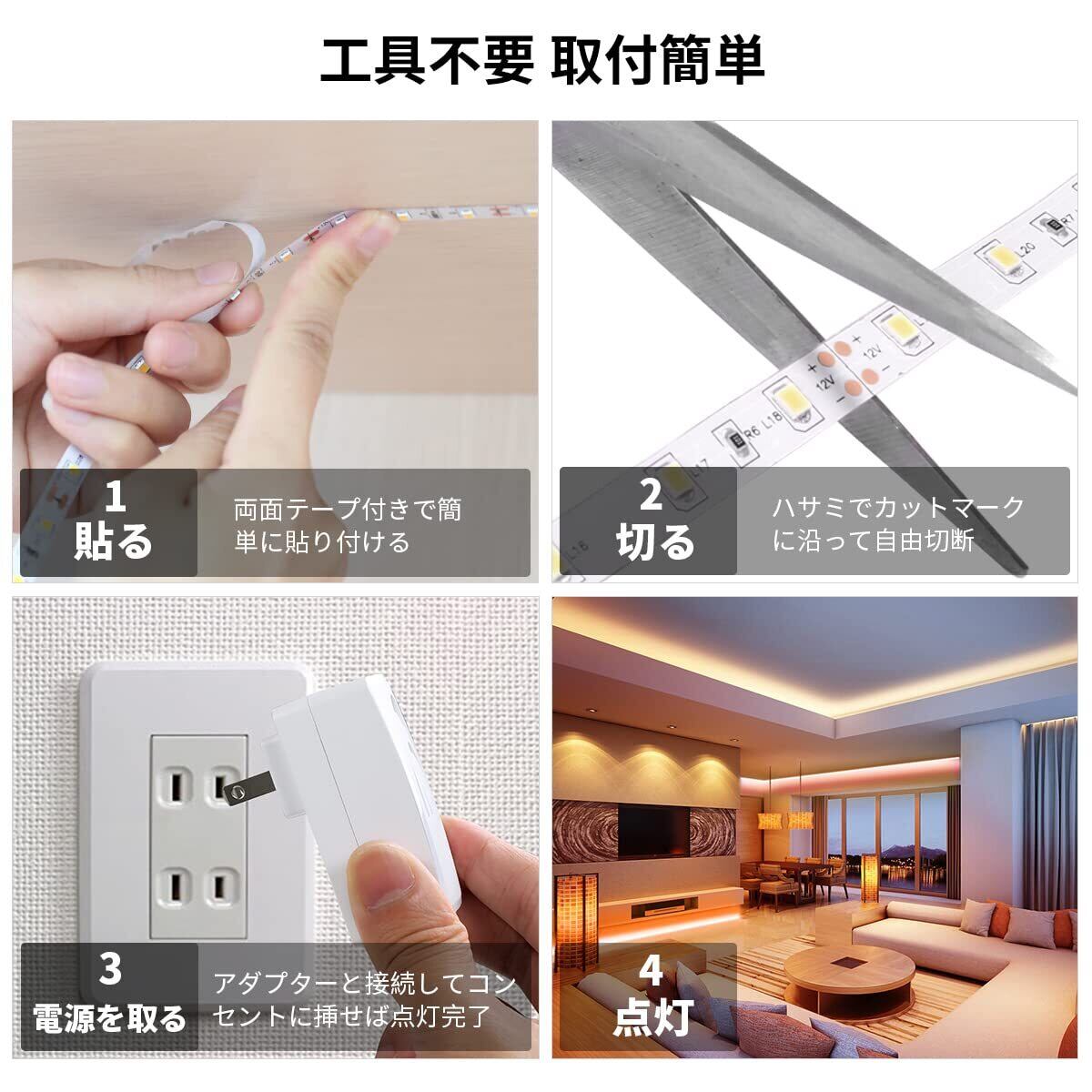 【自由切断可・工事不要・取付簡単】テープライト自体が柔軟性がある強力両面テープなので、自由に曲がれて好きな形に成りやすくて取り付け簡単です。場所や用途に合わせて、1ユニット(LED3個)単位で自由にカット可能、素人でも楽にできます。ledテープを剥がしても痕がつかない、賃貸の方にもおススメ! ※(ご注意:カットライン以外を切断すると、不点灯となります。残った部分は2ピンの2835SMD対応のコネクタで延長できる。)