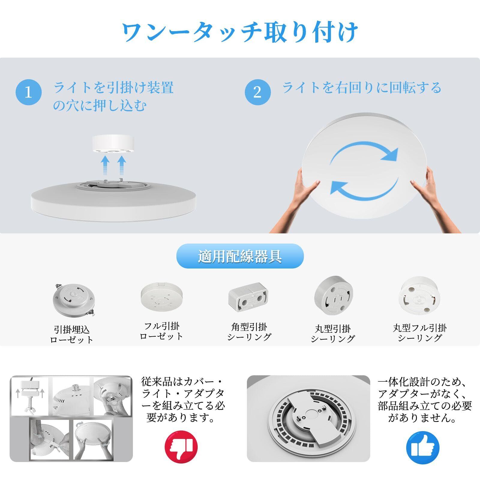 【ワンータッチ取付け】アダプターとライト本体の一体化設計のため、部品組み立ての必要がなく、シーリングライト全体を天井の引掛け装置に押し込んで、右回りに回転するだけで設置完了です。工具・配線も必要がなく、素人で1分間で取り付けます!