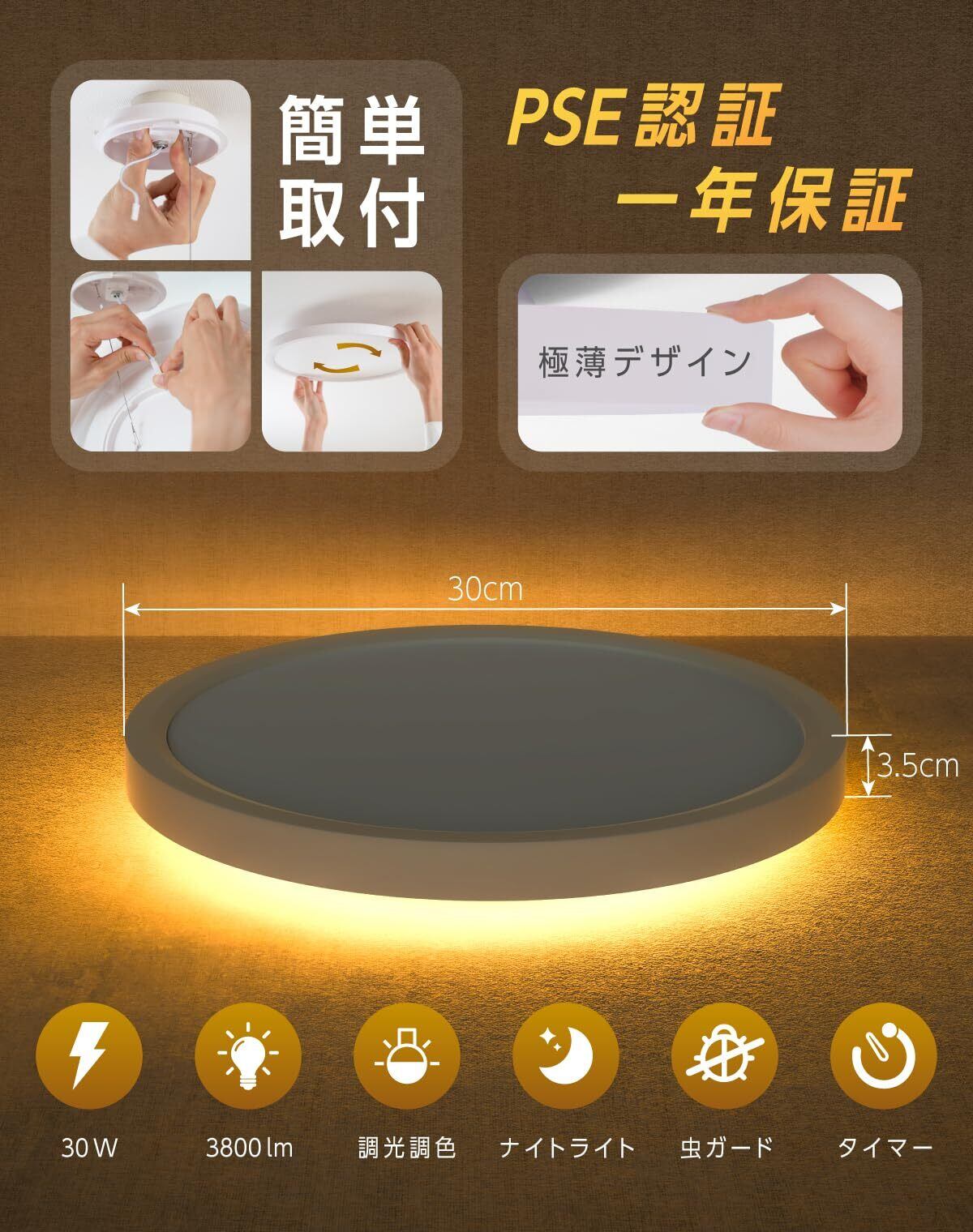 シーリングライト LED 間接照明 調光調色 上下発光 照明器具 節電対策 リモコン操作 タイマー機能 省エネ 薄型 簡単取付 天井照明 和室 洋室 キッチン 寝室 洗面所 リビング 日本語取扱説明書 (単品, 30W)