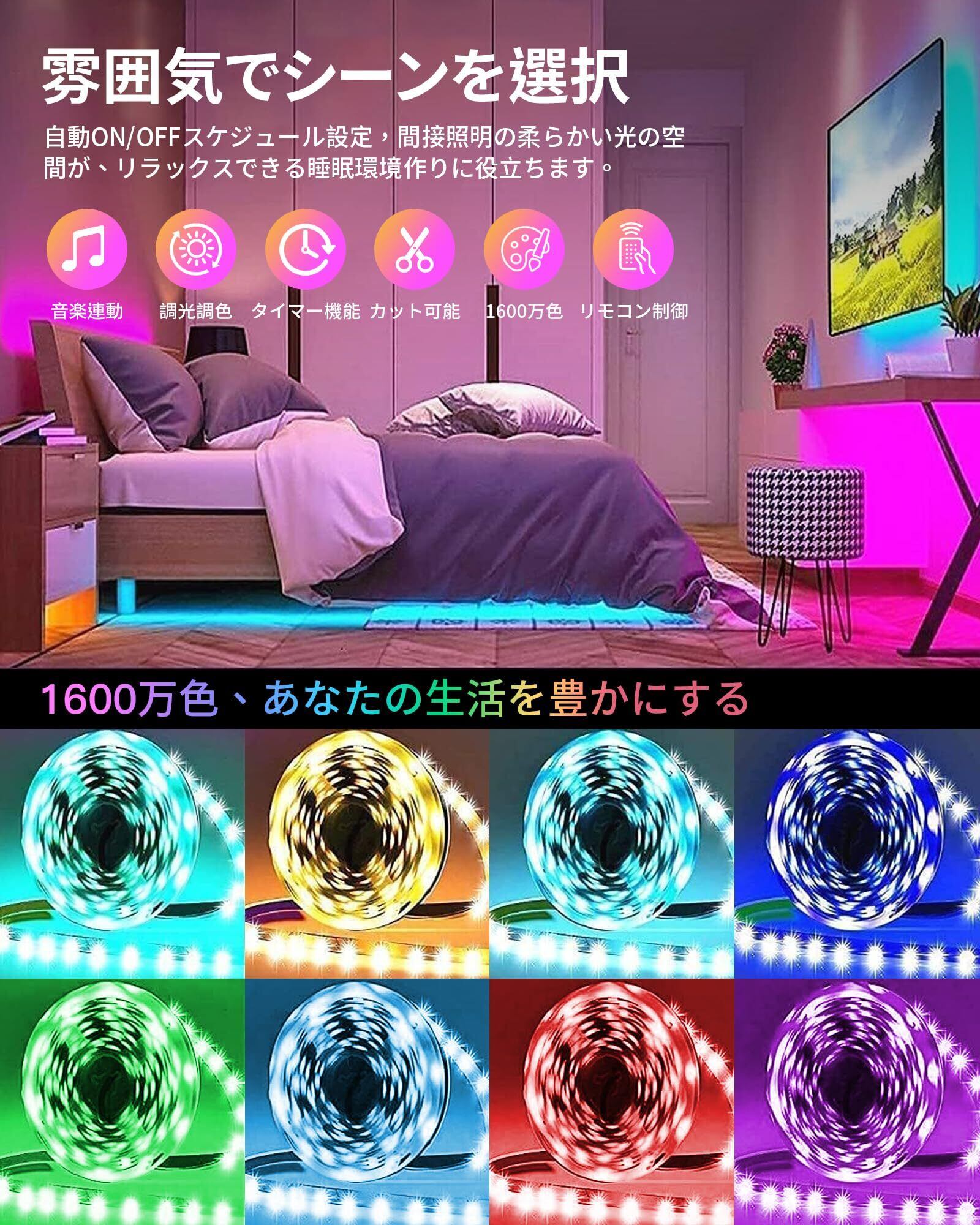 【音楽同期】:音楽同期機能付きLEDテープライト、感度調整可能なマイクを内蔵し、音と音楽のリズムでLEDテープライトの色が変わり、音楽でロマンチック、リラックス、明るいパーティー雰囲気を作り出します。 また、RGB テープライトは1600万色と20のダイナミックモードを搭載しており、明るさ、スピード、色を自由に調整することができます。 好みや気分に合わせて自由に設定でき、生活をよりカラフルに、よりエキサイティングに演出します