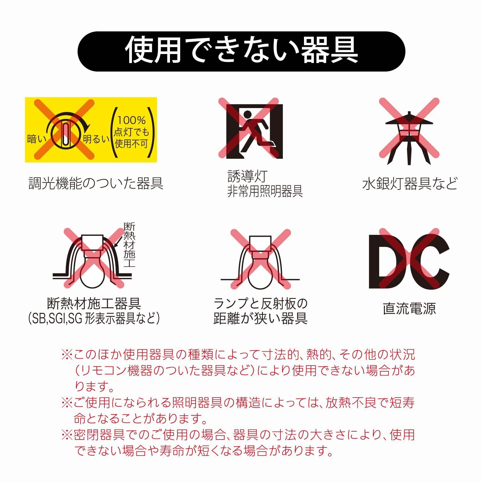 ≪ご注意≫※ 次のような器具には使用できません。 ・調光機能のついた器具(100%点灯でも使用不可) ・誘導灯、非常用照明器具 ・水銀灯器具など ・断熱材施工器具(SB・SGI・SG形表示器具など) ・ランプと反射板の距離が狭い器具 ・直流電流※ このほか使用器具の種類によって寸法的、熱的、その他の状況(リモコン機器のついた器具など)により使用できない場合があります。