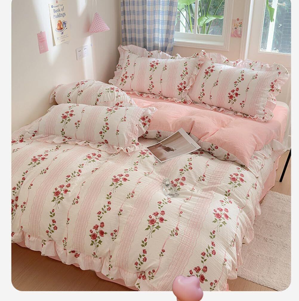 【新着商品】布団カバーセット 3点セット フリル 花柄 寝具カバーセット 掛け布団カバー ボックスシーツ 枕カバー かわいい 洋式・和式兼用 布団カバー ふとんかばー ふとんカバーセット 可愛い 洗い替え 速乾 静電気防止加工 しんぐる (ピンク花柄, シングル)