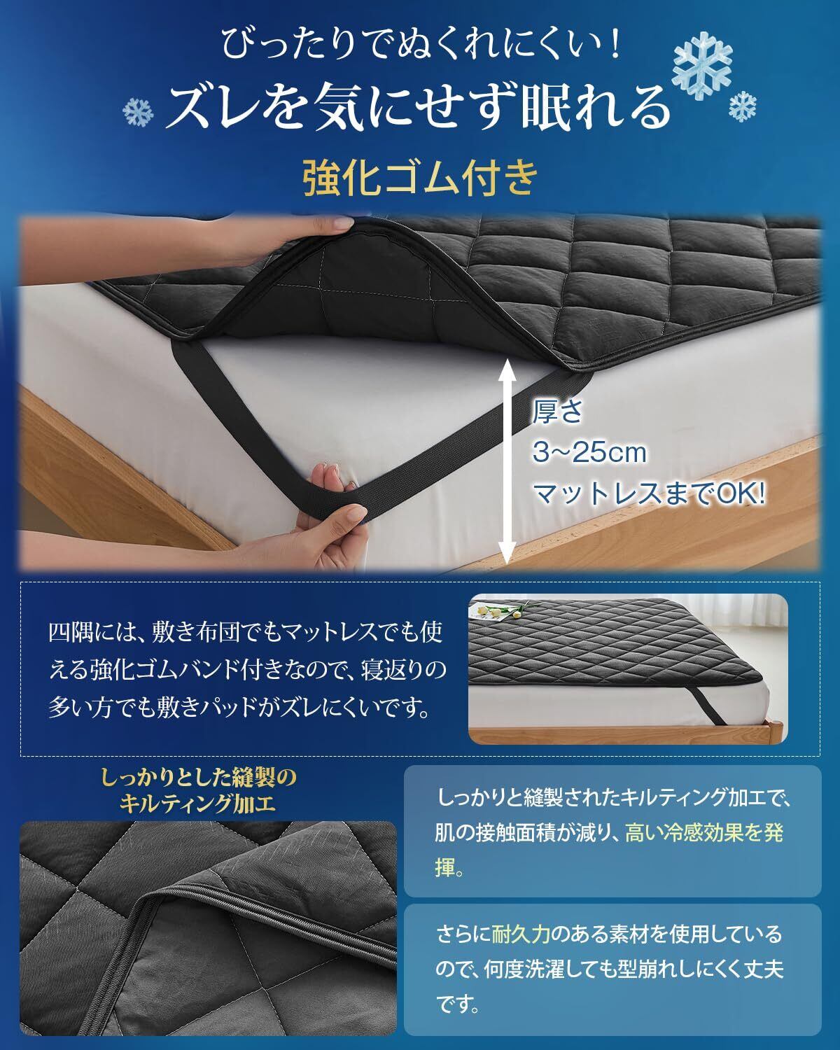 【強化ゴムバンド付き】四隅に強化ゴムを使用し、耐久性アップ。繰り返し装着しても伸びにくく、マットレスにしっかりフィットします。