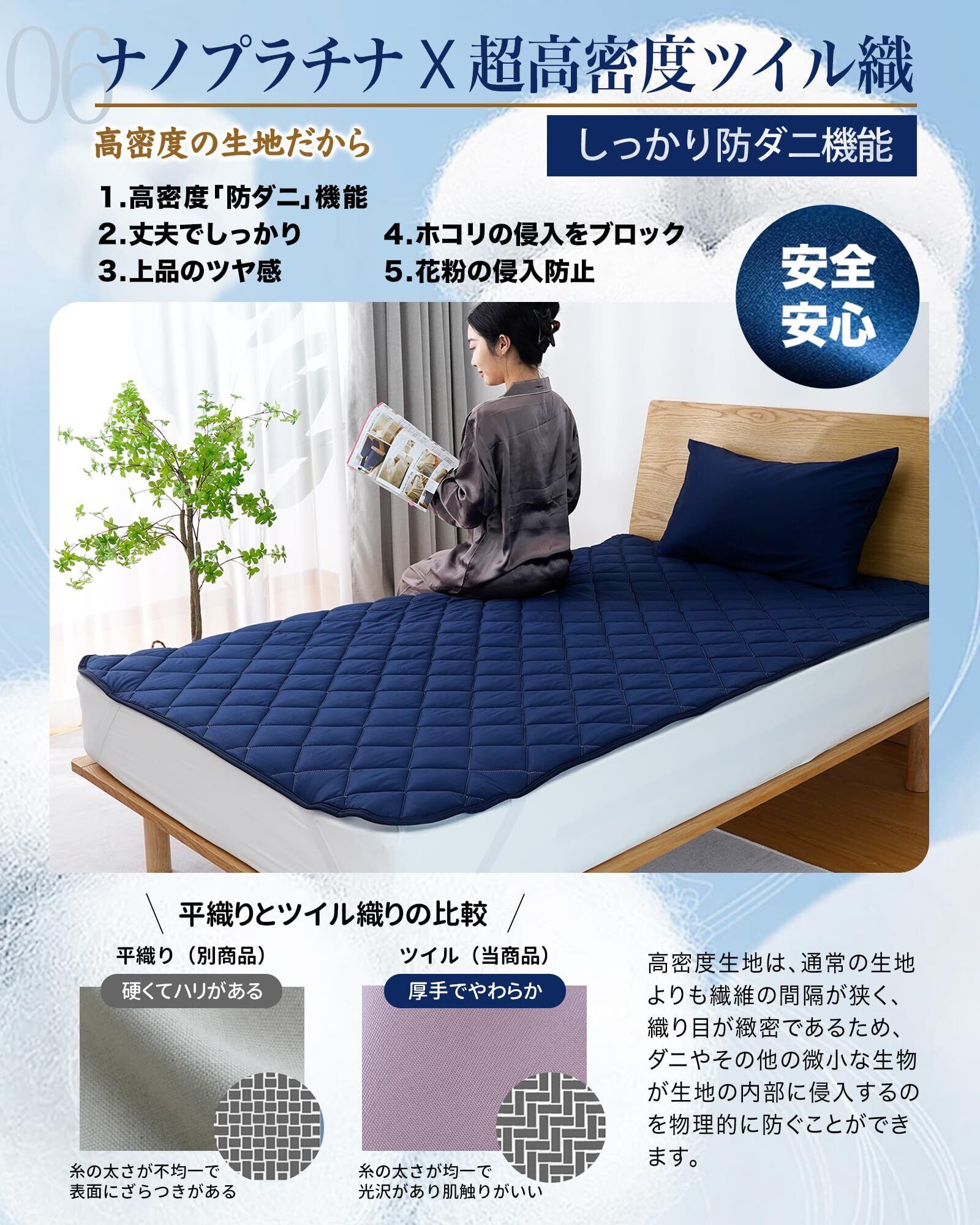 【W防ダニ アレルガード】ダ二でお困りの方にお使いいただける特別な敷きパッドです。日本ナノフラチナ使用技術と高密度ツイル織り、この2つの技術を基に、ダブル抗菌防臭防ダニ機能を追求し、ダニの侵入防止率高めております。高温多湿の日本の環境にフィットして結果抜群!肌が弱いな方やベットと一緒に寝る方もご使用いただけます。掃除の手間も省き、清潔な環境を保ちながら、心地良い睡眠をお楽しみください。豊かな眠りと朝起きたときの爽快さをベットパッドでお届けします。 【オールシーズン大活躍素材 洗濯機対応】「敷きパッド」コートン100% 暑すぎず寒すぎず、保温力が適度にあり、洗濯を重ねて使い込むほど、素材の柔らかさが増やします。春用、夏用、秋用、長い季節に心地よく使えます。<洗濯機で丸洗いOK>:折りたたんで洗濯ネットに入れれば、家庭用の洗濯機でも洗濯可能です。